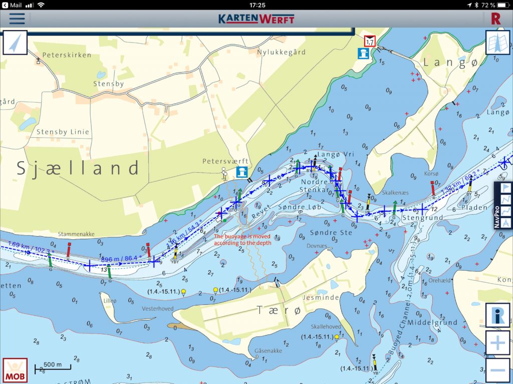 Der Kurs hierher war mal wieder ein anspruchsvoller, denn das Fahrwasser schlängelt sich in richtig schmalen Fahrrinnen zwischen Inseln (Falster, Farø, Bogø, Lilleø, Tærø, Langø, Møn), Flachs und Steinriffen durch. Da sind wir froh, dass wir nur 90cm Tiefgang haben und keine der roten und grünen Tonnen bzw. Kardinalszeichen verfehlt haben.