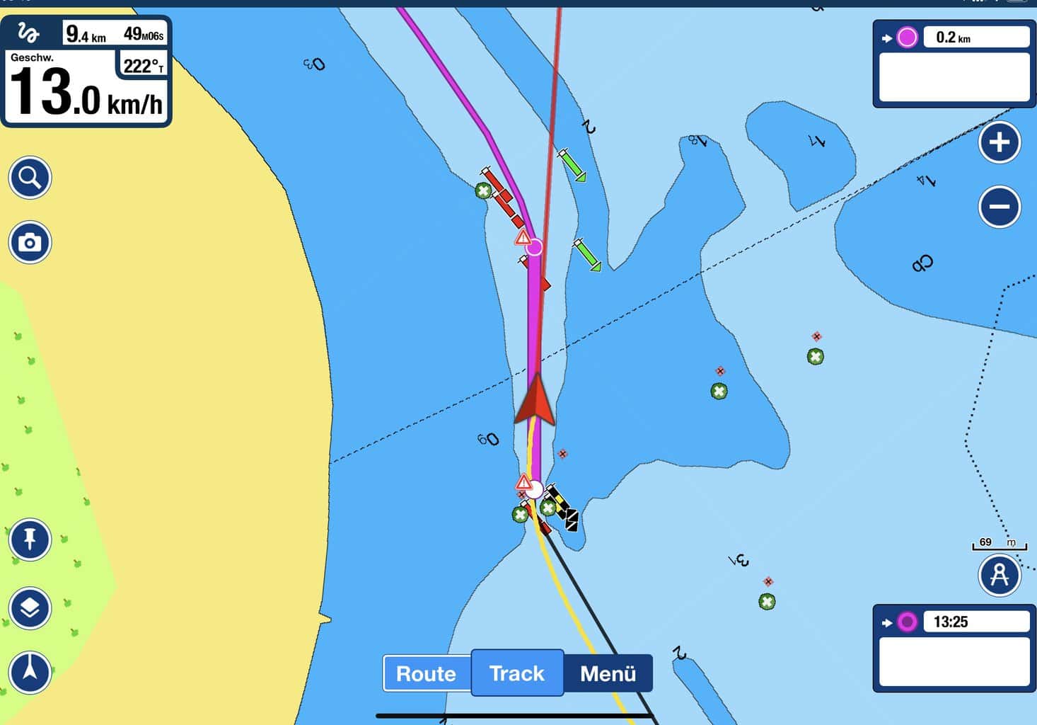 Bei einer ausgewiesenen Tiefe von 2 m kann der Sund allerdings nur mit flach gehenden Schiffen durchfahren werden. In der engen Fahrrinne ist aufmerksames Navigieren angesagt: durch die roten und grünen Tonnen, sowie die Kardinaltonnen, die Gefahrenstellen (Untiefen / Steine) anzeigen.