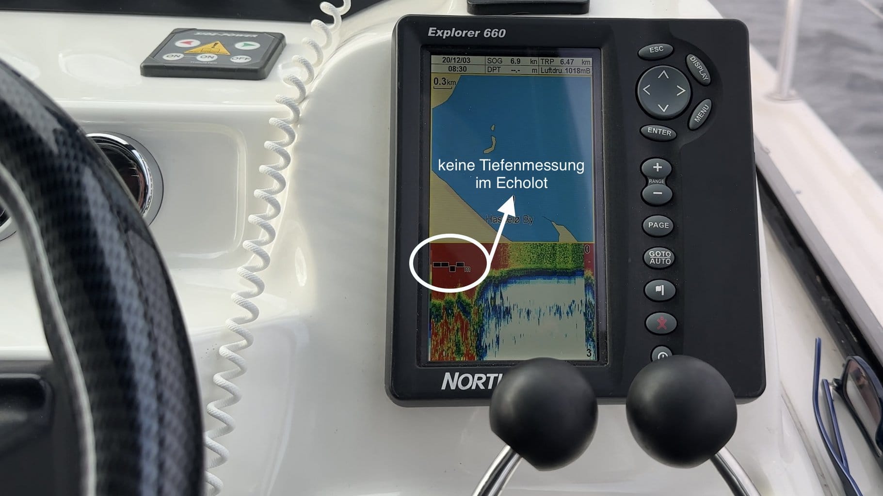 Unser Echolot zeigt zum Teil gar nix mehr an, wahrscheinlich ist die Fahrrinne mit Seegras zugewachen.