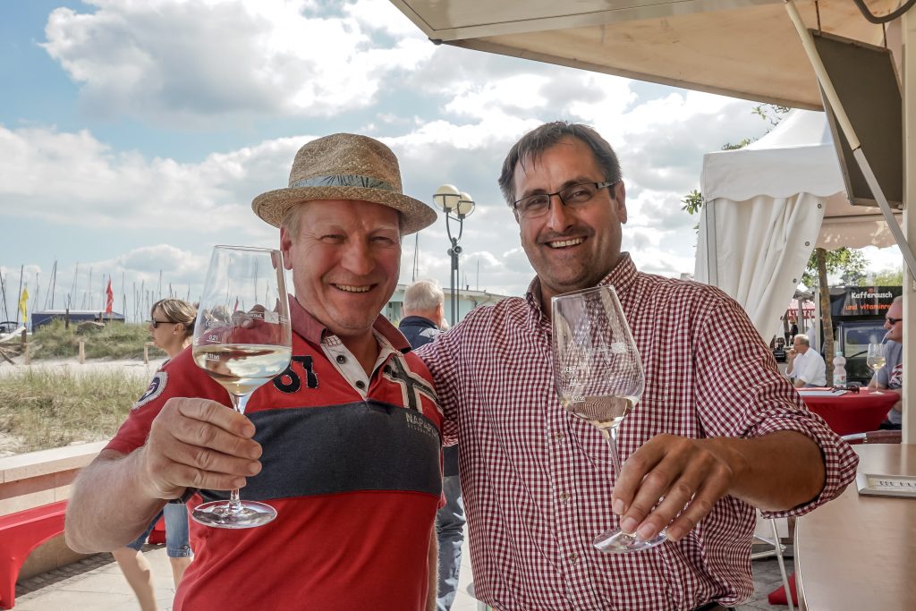 Kaum haben wir die Promenade betreten, stoßen wir auf einen rheinhessischen Weinstand mit ‚Pfälzer Liedern‘?!? Das war der Anfang einer feuchtfröhlichen Runde mit dem Weingutsbesitzer. Als sich herausstellt, dass Gerald dann auch noch weitläufig mit Wolfgangs Mutter verwandt sein muss, war’s um uns geschehen. Die Welt ist doch klein:)