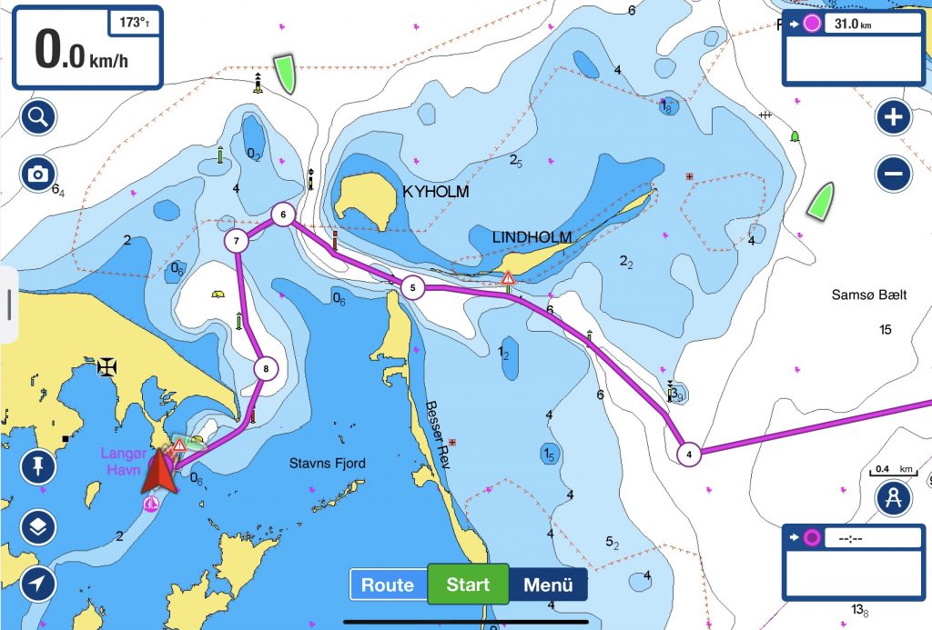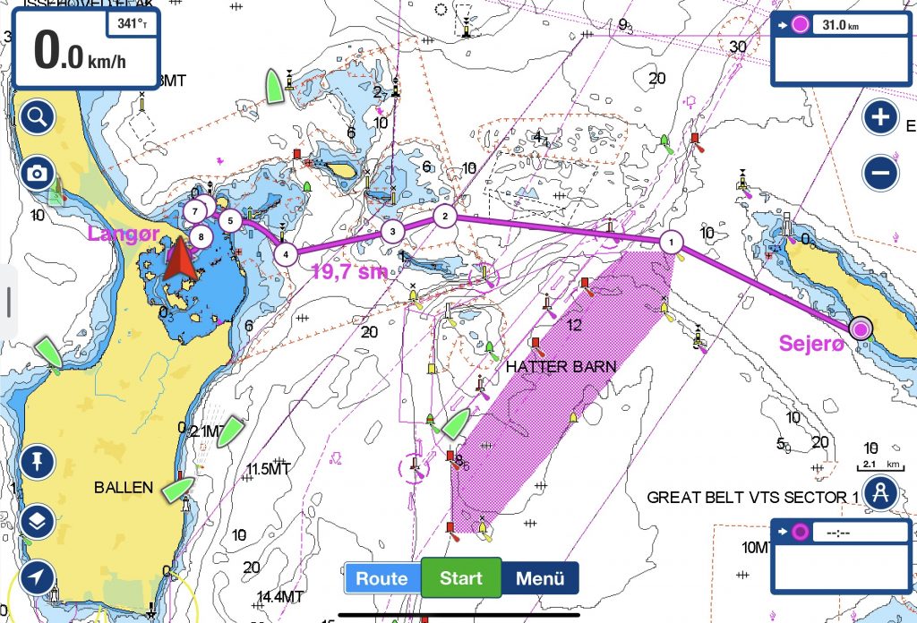 Dann sind die Maschinen startklar und wir überqueren den Samsø Belt. Hier heißt es auch wieder aufpassen im Verkehrstrennungsgebiet (VTG) des Großen Belts. Zahlreiche dicke Pötte sind unterwegs.