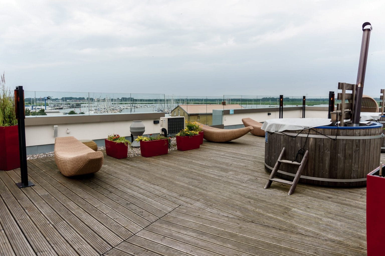 Hier in Kröslin könnten wir unser ‚tristes Seefahrerleben‘ an Land aufpeppen: es gäbe einen Wohlfühl-Wellness-Bereich, eine Saunalandschaft sowie ‚Badebottiche‘ auf dem Dach.