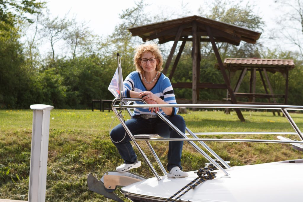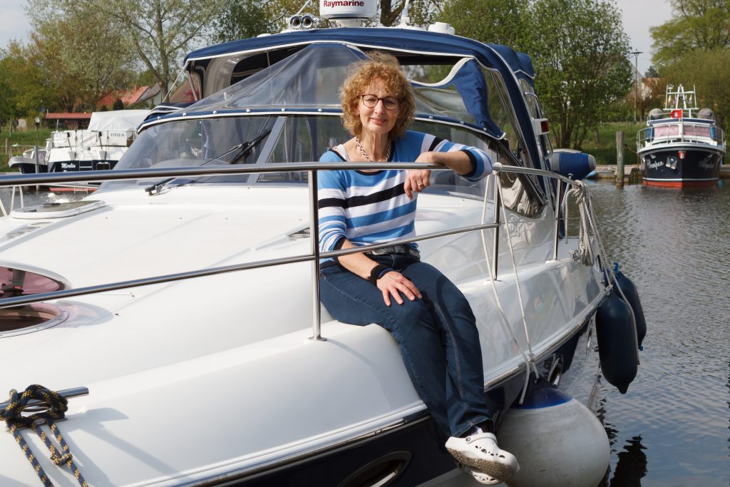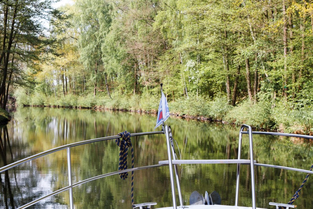 Wir tuckern in atemberaubendem Tempo von 10 km/h gen Westen. Ein Reh hat uns begrüßt, die Graureiher, Enten und Schwäne kennen uns auch noch. Ich meine sogar, einen Eisvogel vorm Bug gesehen zu haben.