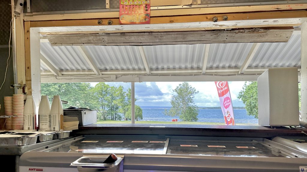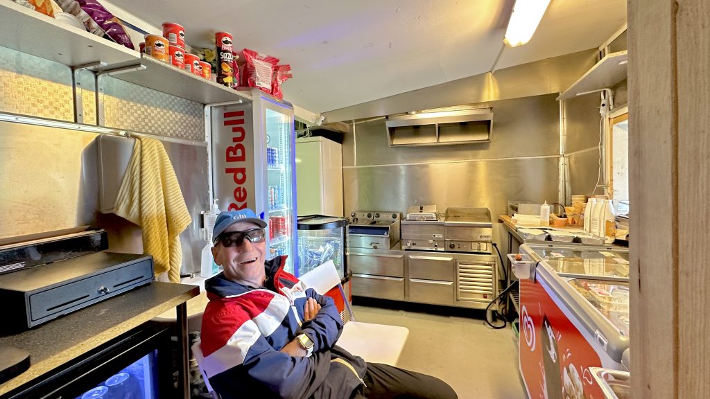 Ein Student aus dem Kosovo, der hier zur Finanzierung seiner Semestergebühren jobbt, bittet uns sofort in den Kiosk hinein und gewährt uns Asyl im Trockenen.