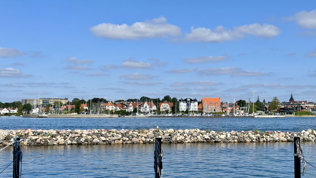 Im Vindeby Havn erfreuen wir uns an der schönen Aussicht auf die ‘Skyline’ Svendborgs und die 80 Meter hohe elegante Brücke über den Svendborgsund.
