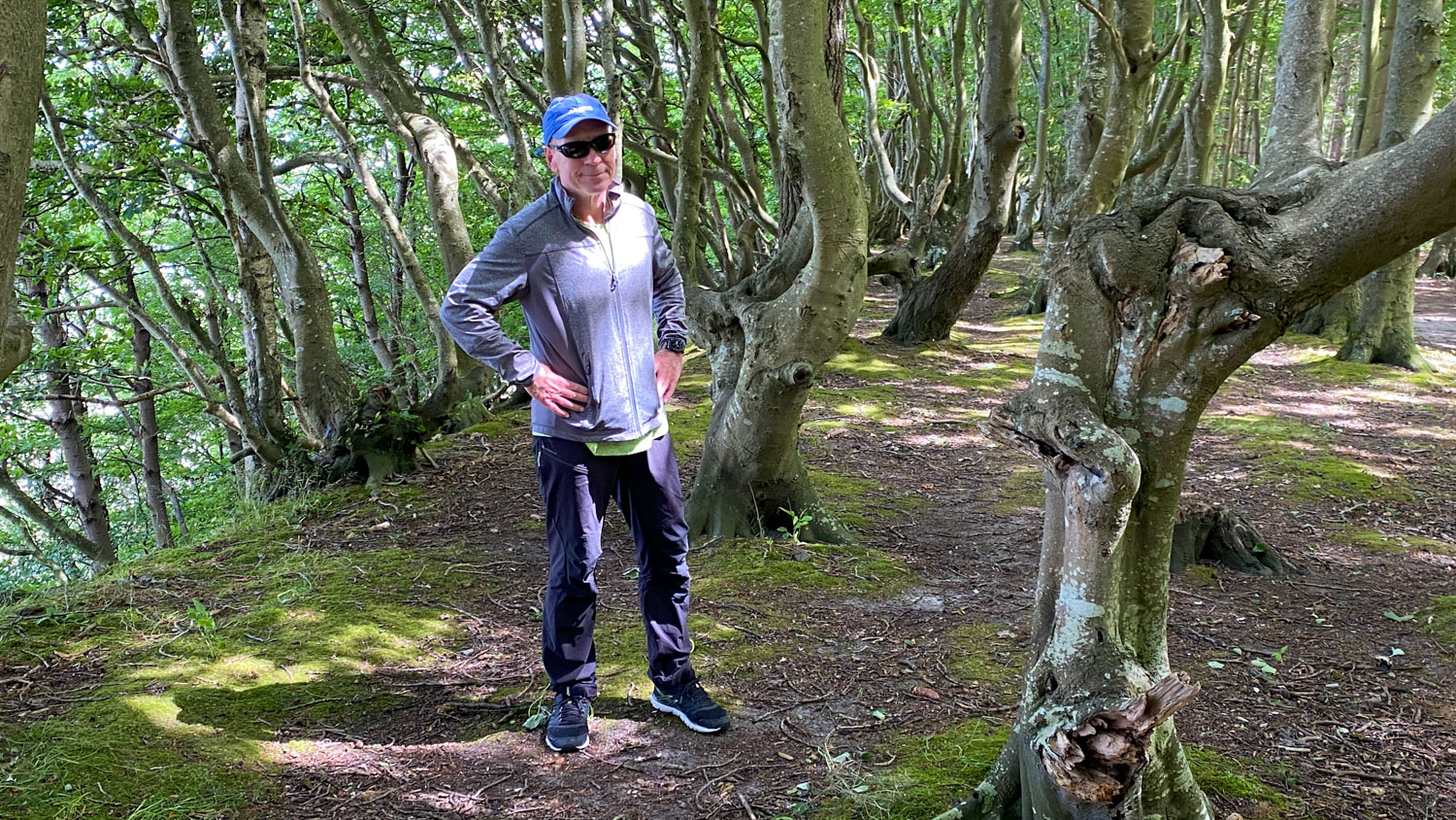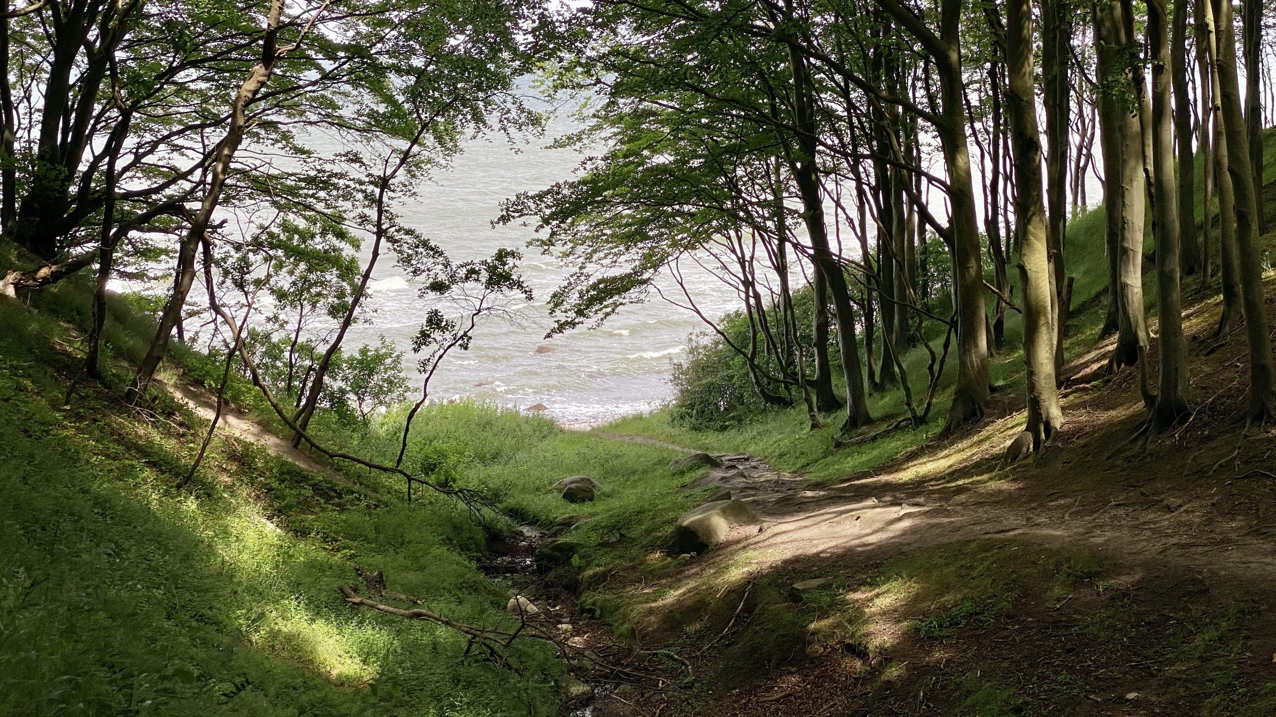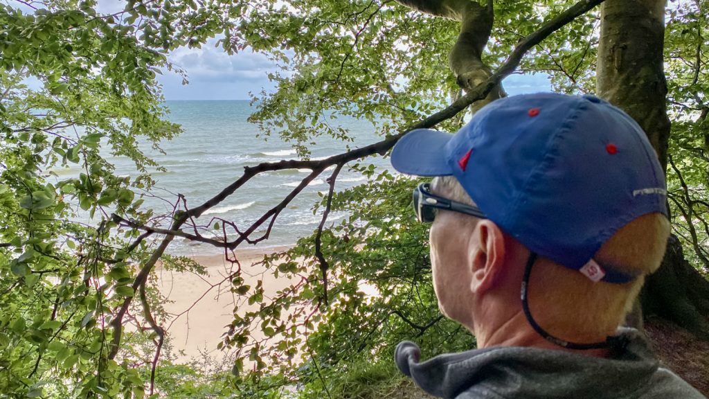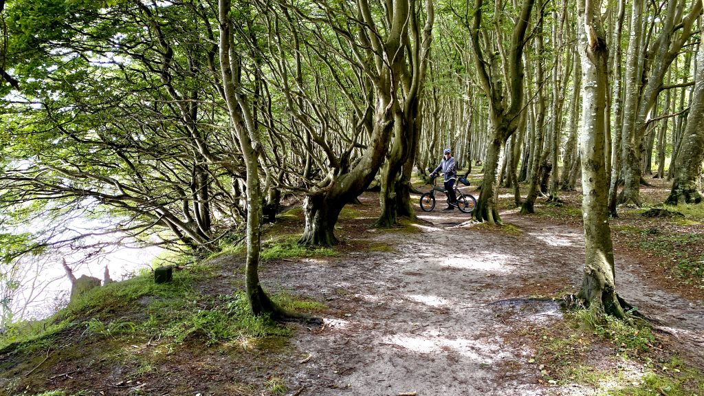 Der Captain findet eine anspruchsvolle „Kap-Mountainbike-Tour“ – weitab vom Straßenverkehr – durch ein märchenhaftes Waldstück immer an der Steilküste entlang. Auf sehr schmalen Waldwegen radeln wir über Wurzeln, Steine, Löcher und sandige Passagen oft direkt an der Abbruchkante entlang: