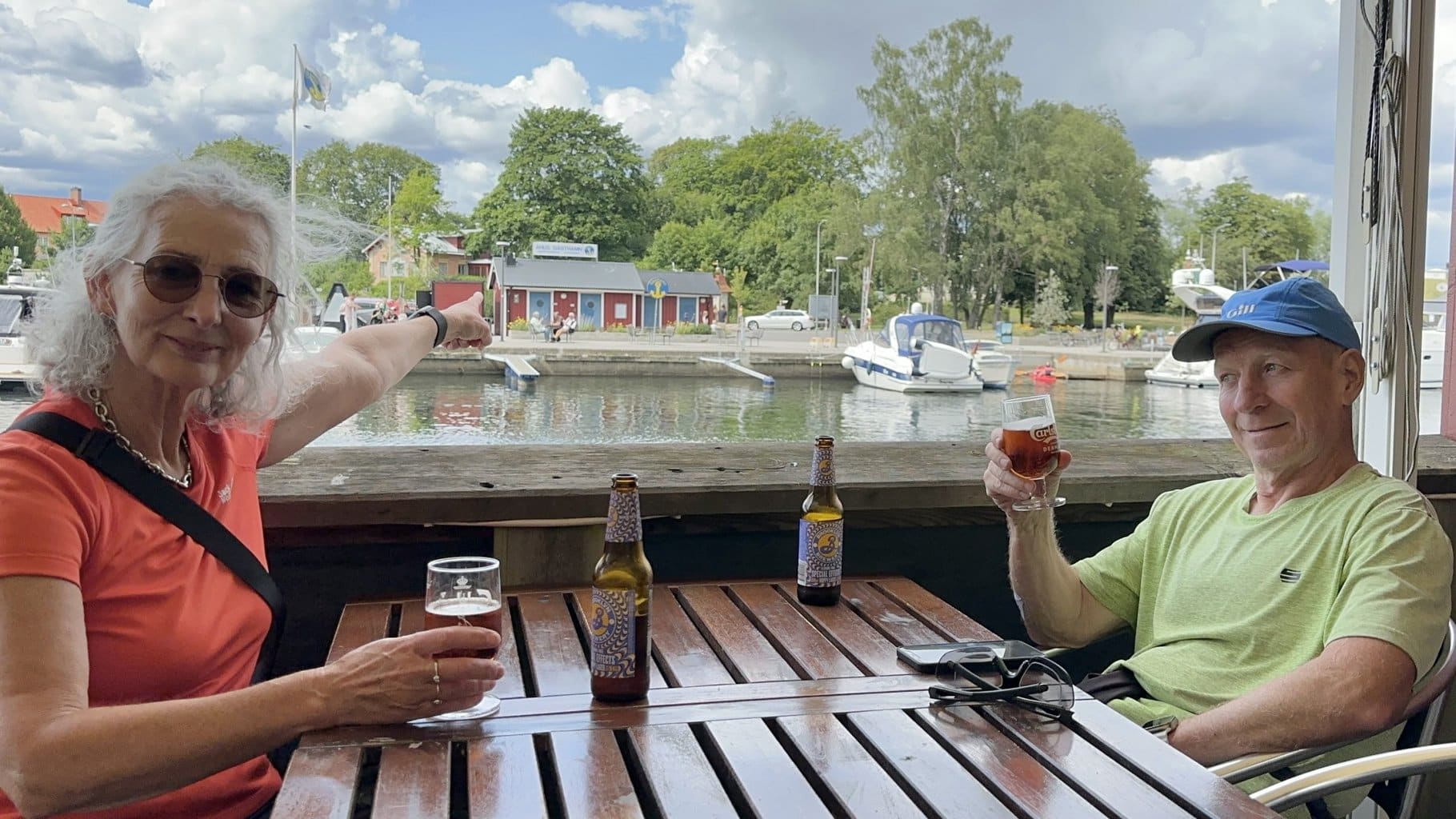Man lässt sich zum Abendessen mit der kostenlosen Fähre auf die andere Seite des Flüsschens Helge å schippern.