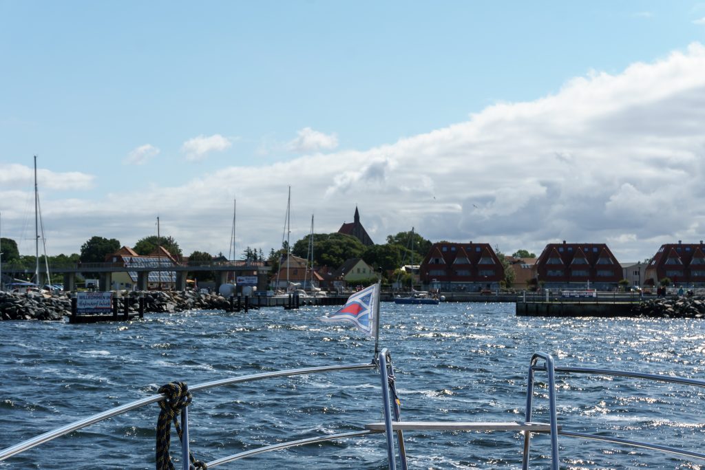 In Verdrängerfahrt geht’s im engen Fahrwasser durch die Boddengewässer nach Wiek – heute fernab der Touristenströme!
