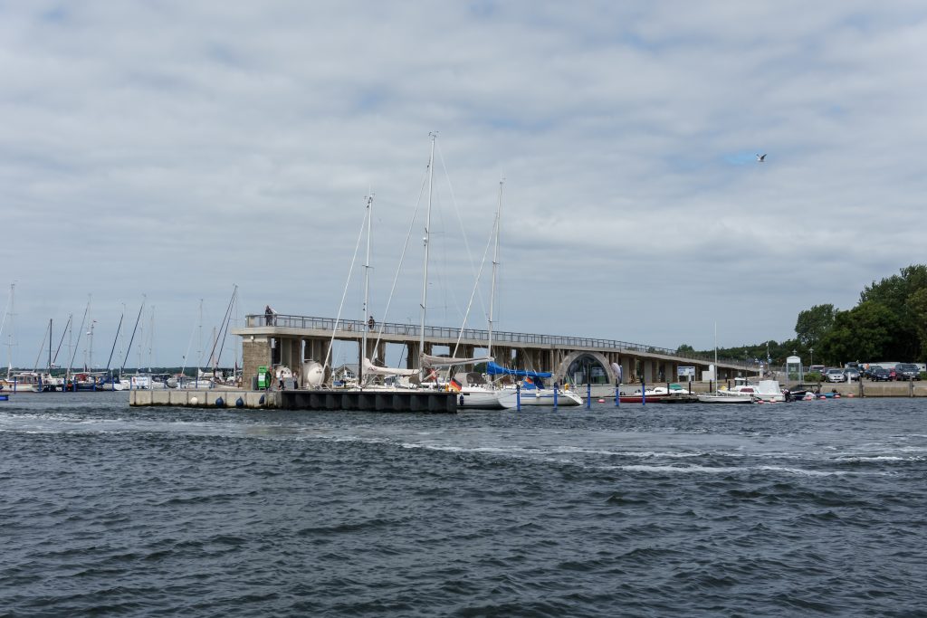 Im Hafendorf Wiek auf der Halbinsel Wittow finden wir einen tollen Platz am Kopfsteg mit Blick auf die ‚Hafenpromenade‘ und eine alte ‚Kreideverladestation‘.