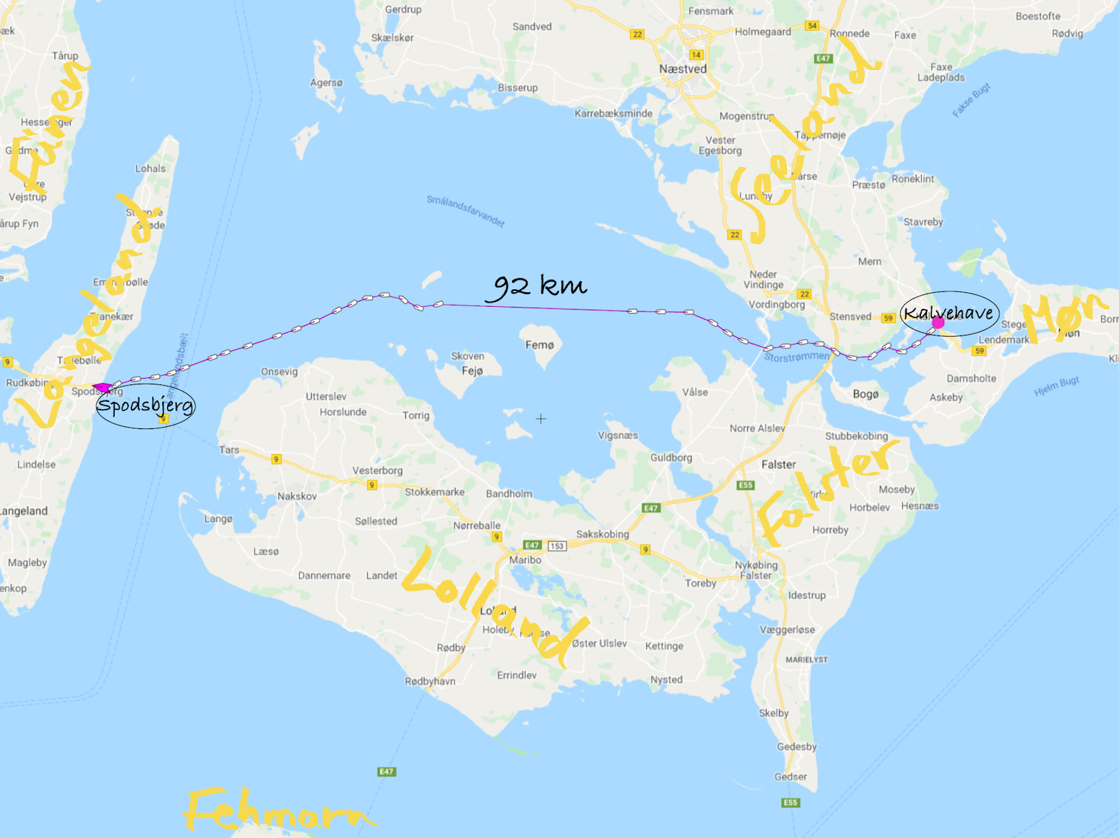 Wir unterqueren wir 3 gewaltige Brücken, passieren unzählige Inseln (von Sjælland startend vorbei an Langø, Tærø, Farø, Falster, Askø, Lilleø, Fejø, Femø, Vejrø, Ragø, Lolland bis Langeland) und kreuzen diverse Fahrwasser (Ulvsund, Storstrømmen, Smålandstarvandet, Langelandsbelt).