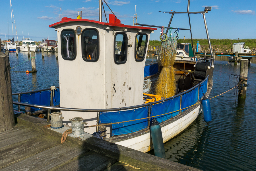 Hier liegt eine Flotte von Charterbooten für Angler parat, um zum Meeresangeln auf Dorsch und Scholle auszufahren. Die gibt es wohl reichlich im ‚Kleinen Belt‚ – prall gefüllte Kühlboxen werden über die Stege geschleppt.