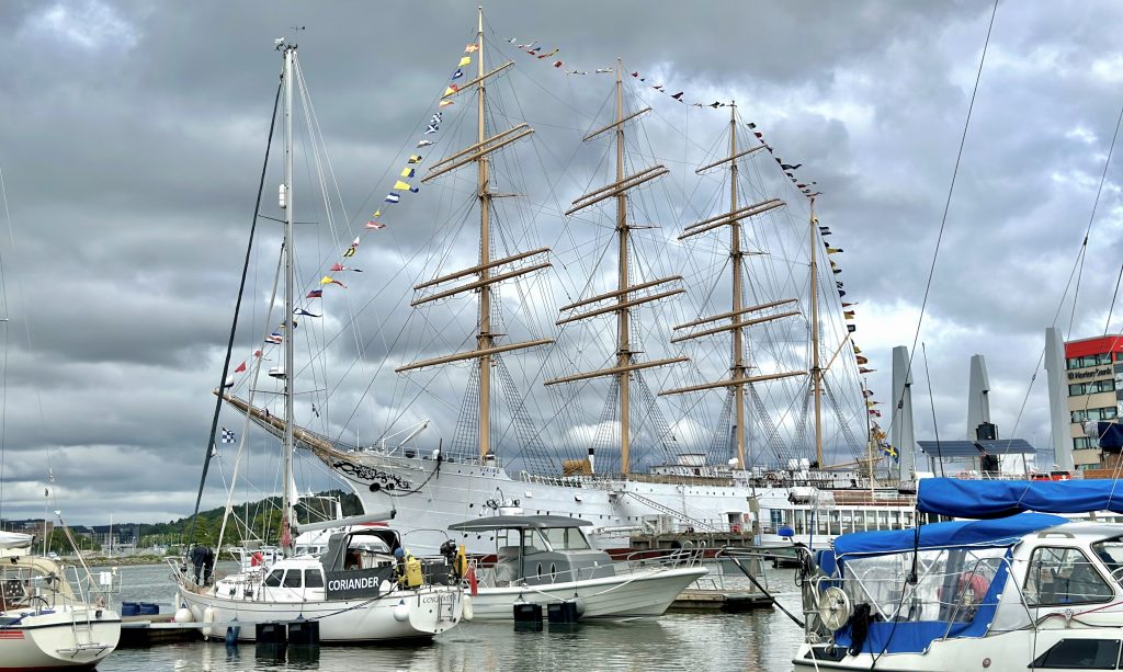 Die Viking hat eine Länge von rund 108 Metern und ragt mit ihrem filigranen Rigg majestätisch über die Hafenbauten.