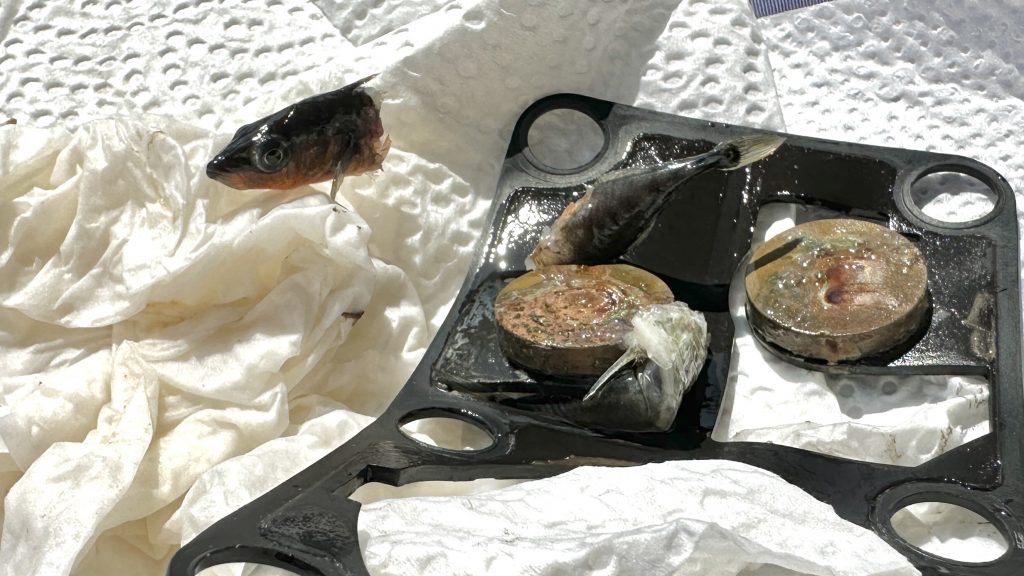 Ein kleiner Fisch wurde von unserer Bordtoilette angesaugt … er hat‘s nicht überlebt … der Captain waltete seines Amtes, zerlegte die Pumpe, entfernte das Corpus Delicti und erneuerte die Dichtungsmembran. Jetzt funktioniert die Bordtoilette wieder – zum Glück.