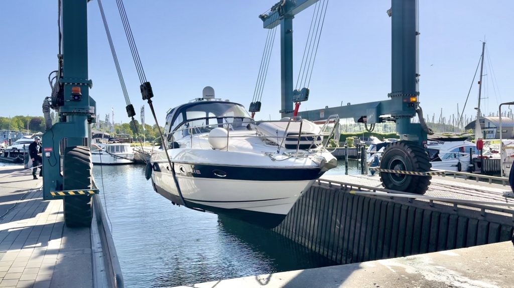 Gestern wurde unsere Allure bei herrlich sonnigem Wetter (im Moment sind wir auf der richtigen Seite Deutschlands) schon zeitig um 9:00 Uhr zum Kranplatz gefahren, um sie dort in die Seile zu hängen und dann unter Captain‘s aufmerksamem Blick wieder ins kühle Ostseewasser zu befördern.