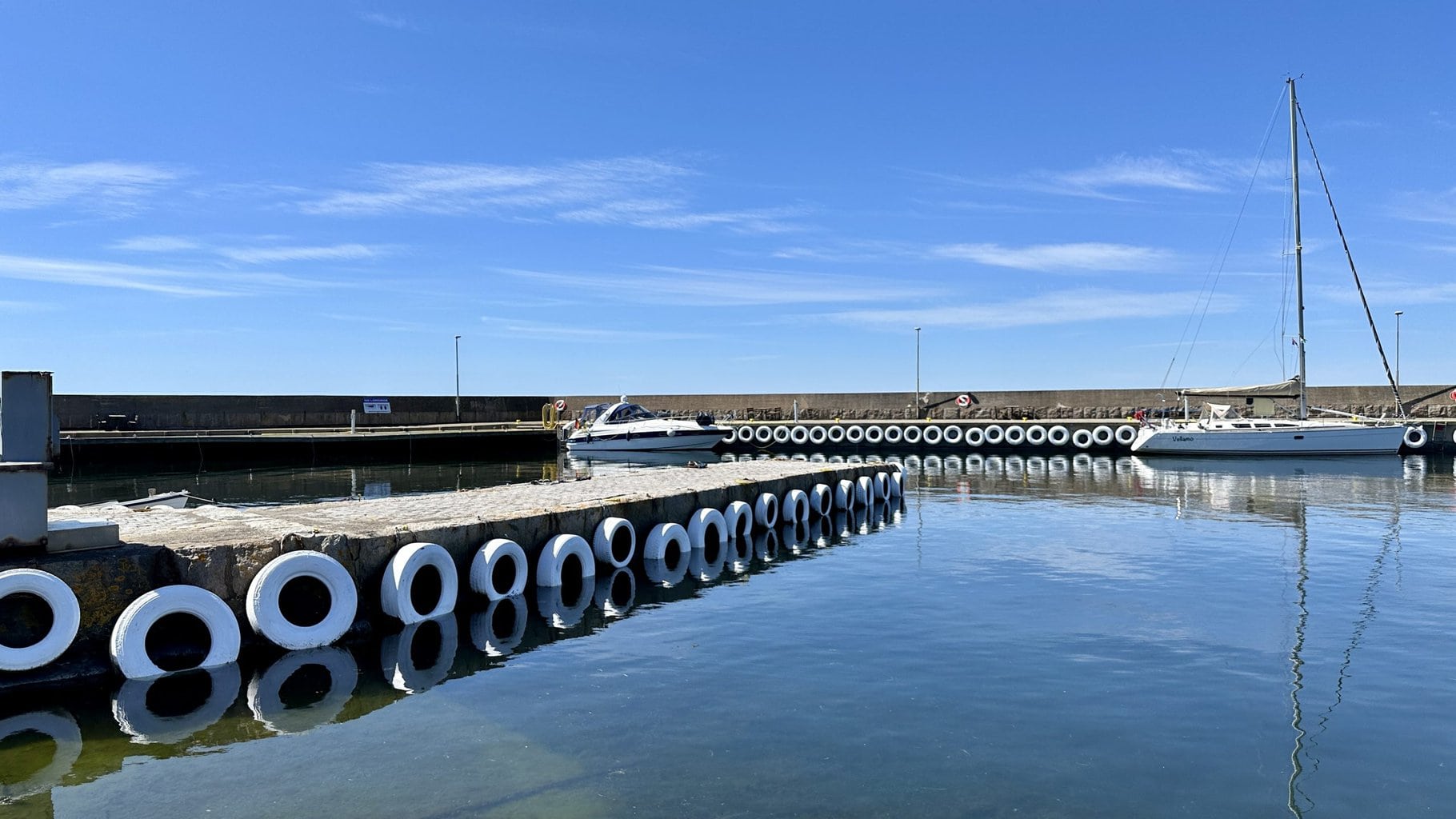Im wunderschönen, kleinen Gäste- und Fährhafen machen wir längsseits an der Kaimauer fest, während andere Boote gerade am Ablegen sind.