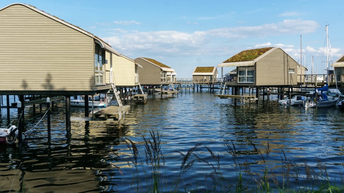 An den Stegen des Hafens liegen jedoch nicht nur Yachten, es gibt hier auch exklusive ‚Pfahlhäuser‘ mit großen Holzterrassen – nach maledivischem Vorbild – zu mieten. Man residiert dann auf 2,40m Höhe über dem Wasser.