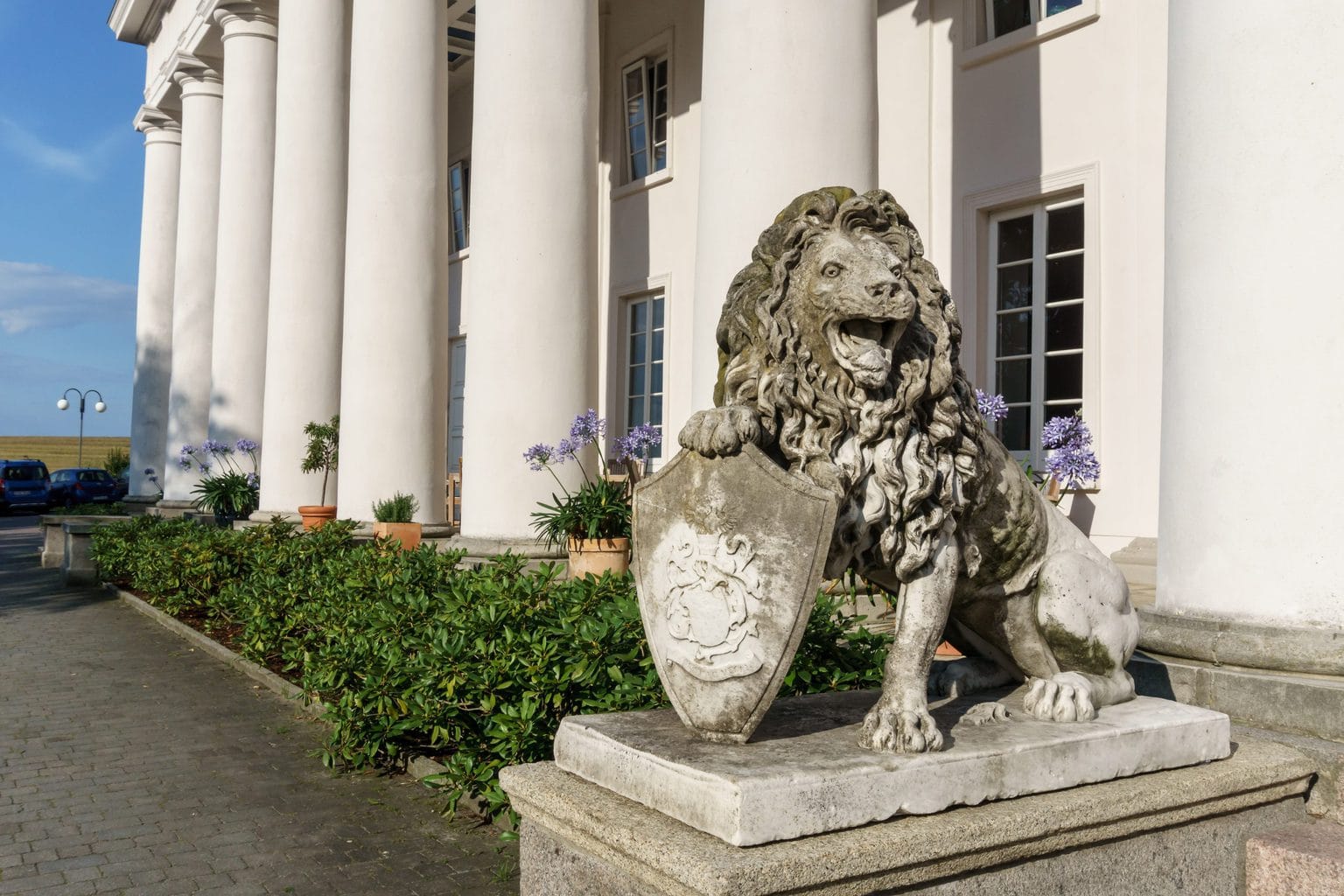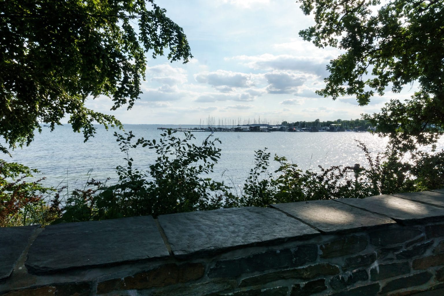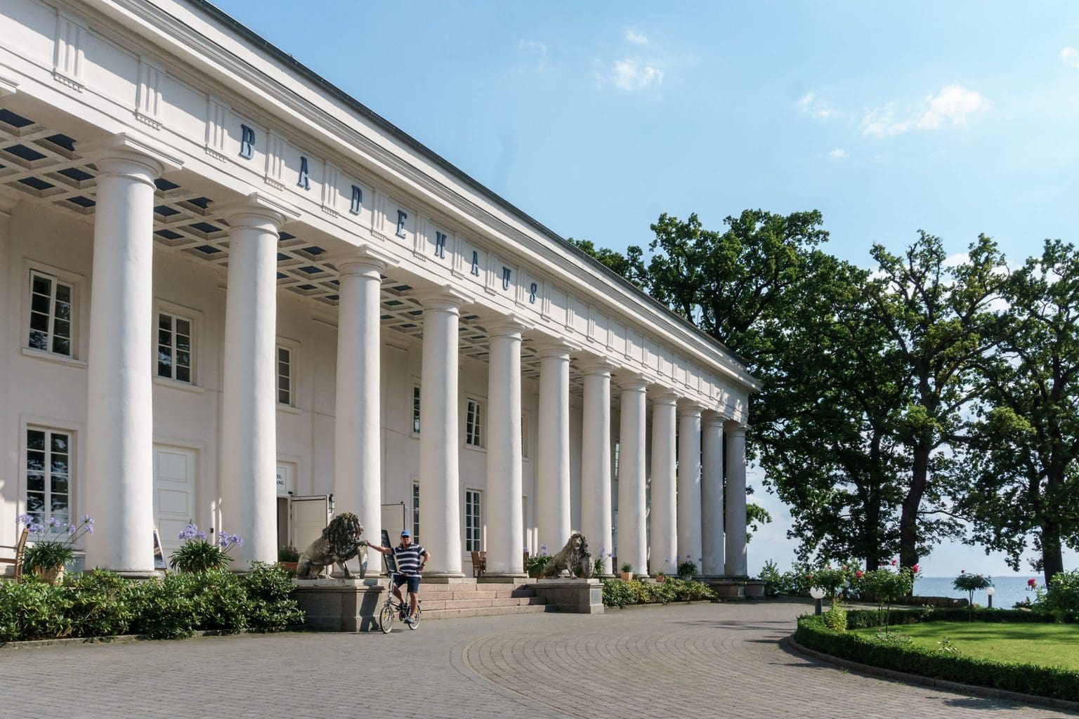 Vis-à-vis des Yachthafens leuchtet etwas Weißes aus dem Wald. Es ist die langgestreckte weiße Säulenfront des Hotels ‚Badehaus Goor‘ – sieht traumhaft aus! Hier treffen wir überraschend Bekannte aus unserer Heimat 😎, die auch noch familiär mit diesem Etablissement verbunden sind:).
