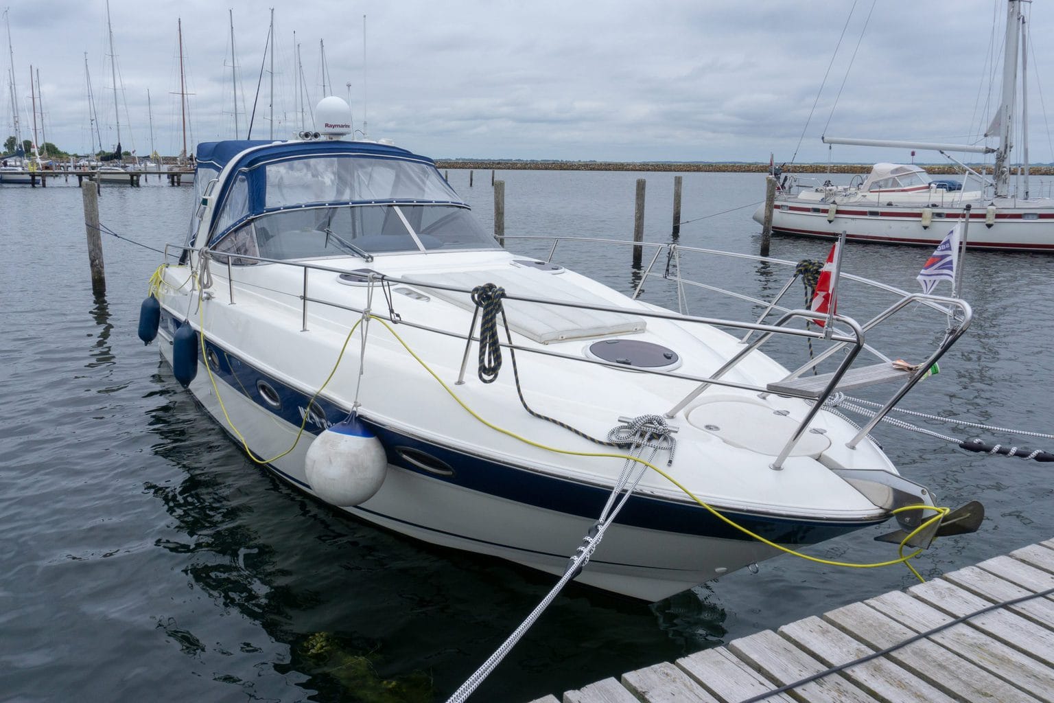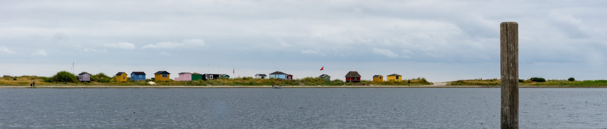 Vom Bug aus sehen wir die vielen bunten ‚Marstaler Badehäuser‘ auf der schmalen Landzunge Eriks Hale.