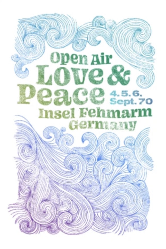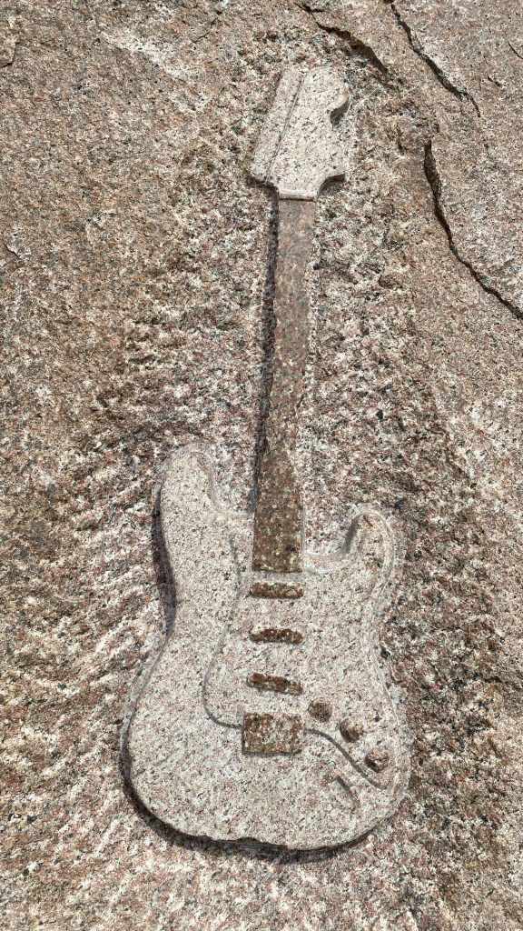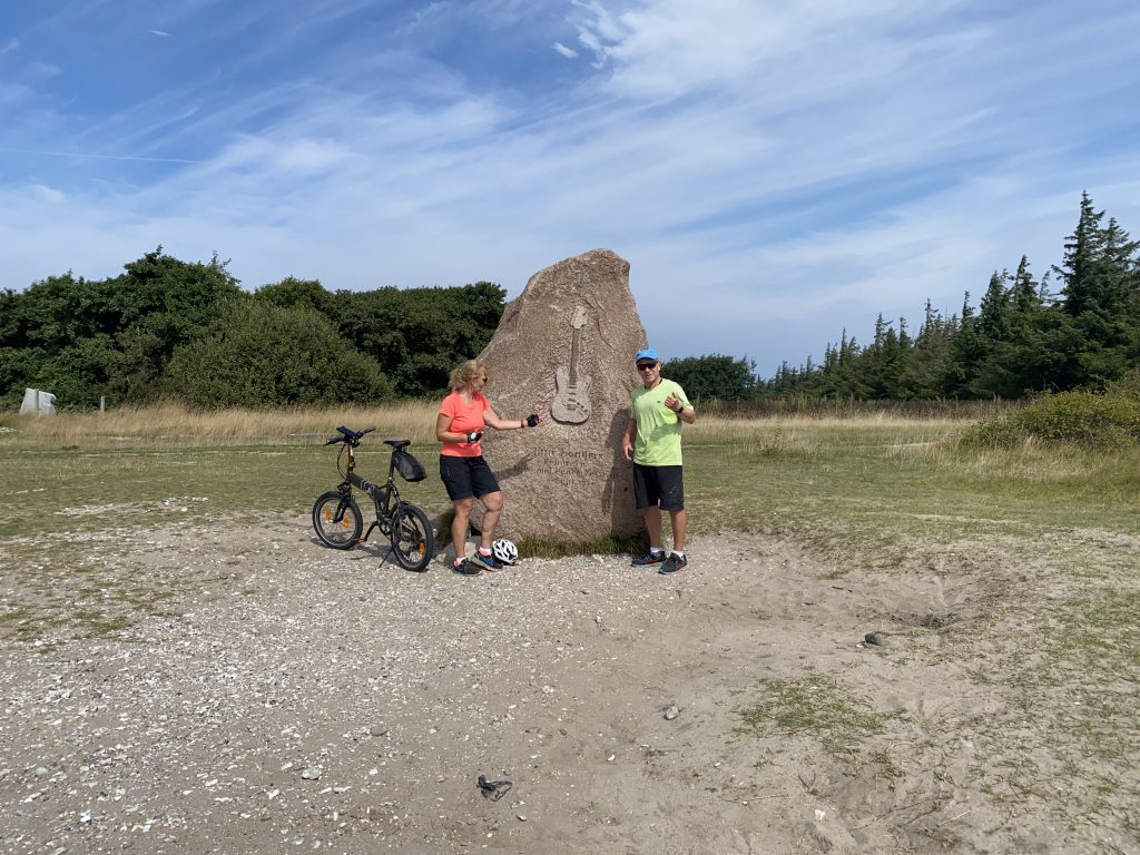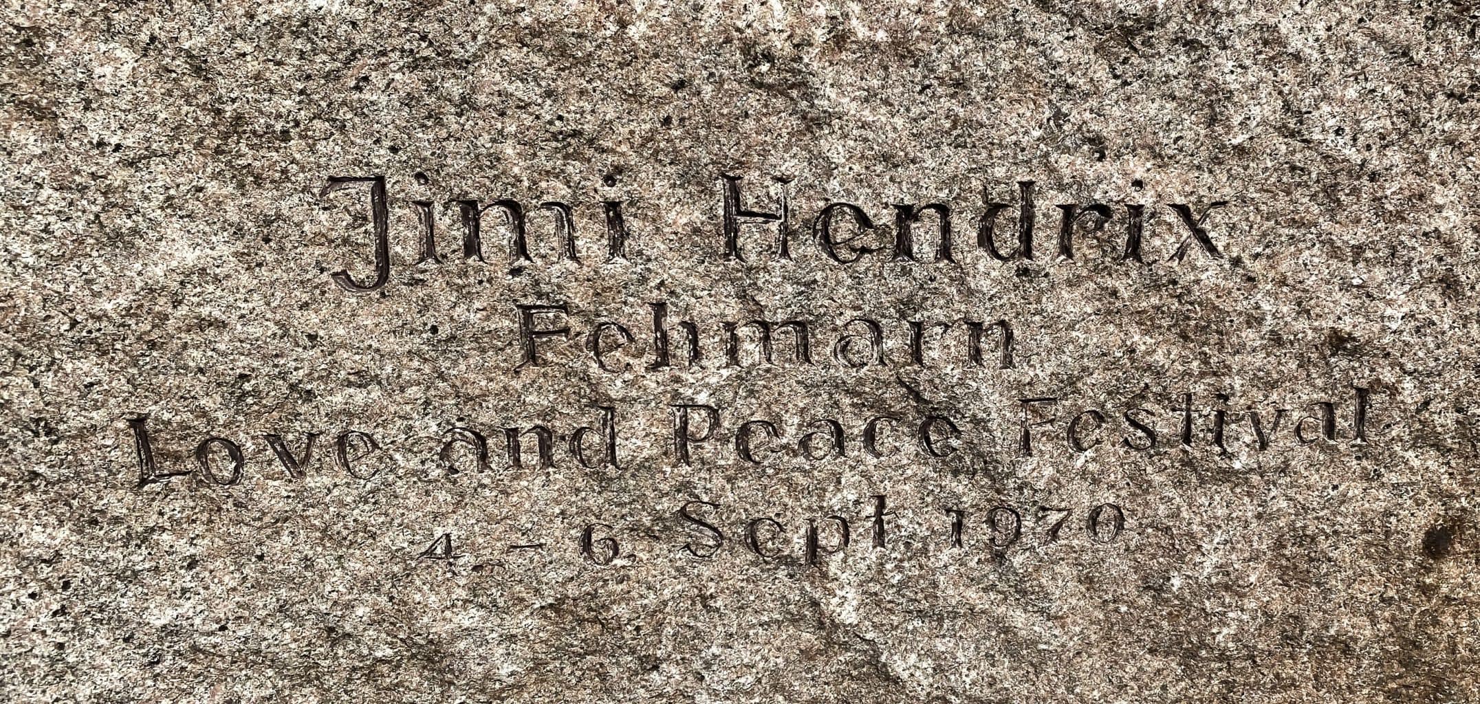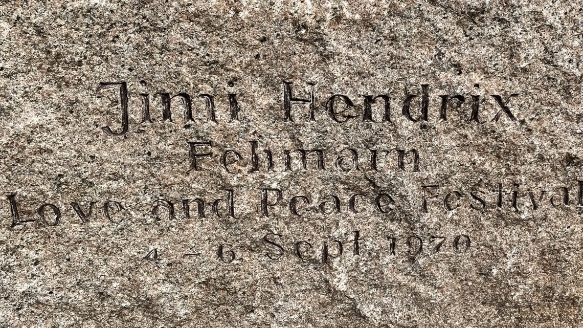 Ein Gedenkstein aus rotem Granit, der an der damaligen Stelle der Bühne aufgestellt ist, an der das Love-and-Peace-Festival (4.-6. Sept. 1970) und Jimi Hendrix‚ letzter Festivalauftritt stattfand.