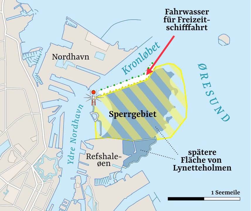 An der Nordzufahrt des Ydre Nordhavn wird in den kommenden Jahrzehnten eine neue Halbinsel – Lynetteholmen – entstehen. Eine Schutzmaßnahme gegen die zunehmenenden Sturmfluten aufgrund des Klimawandels.