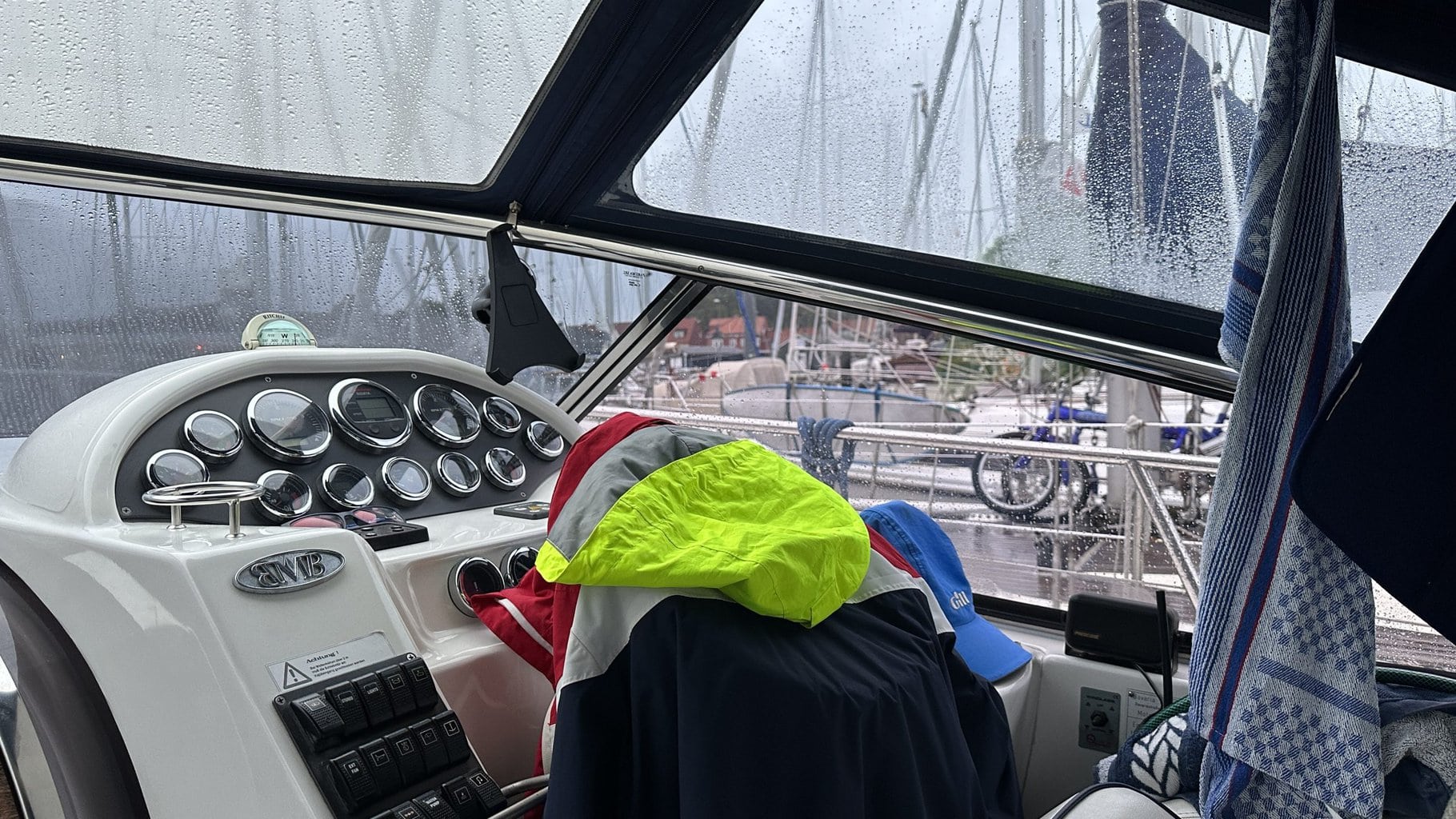 Es wird immer ungemütlicher draußen, ein dickes Regenband zieht über die Ostsee und die Skipper verkrümeln sich unter Deck. Wir schalten mal wieder den Heizlüfter an und genießen den Rundumblick aus unserer Plicht.