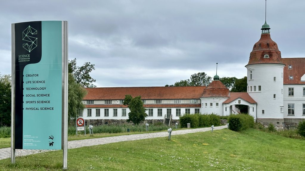 Ein Pausenhof mitten im historischen Schlosspark von Nordborg, mit Blick auf einen glitzernden See, alten Bäumen .. da würde doch jeder gerne die Schulbank drücken!