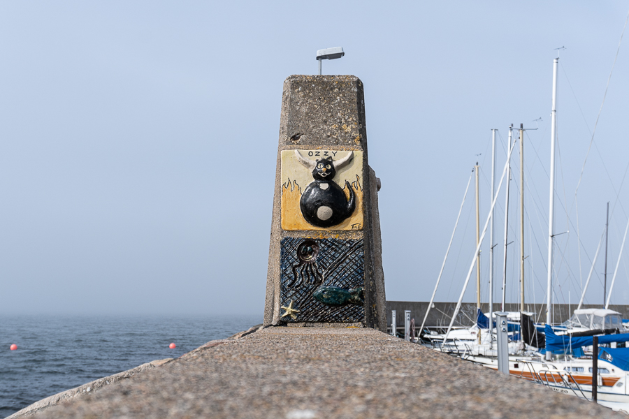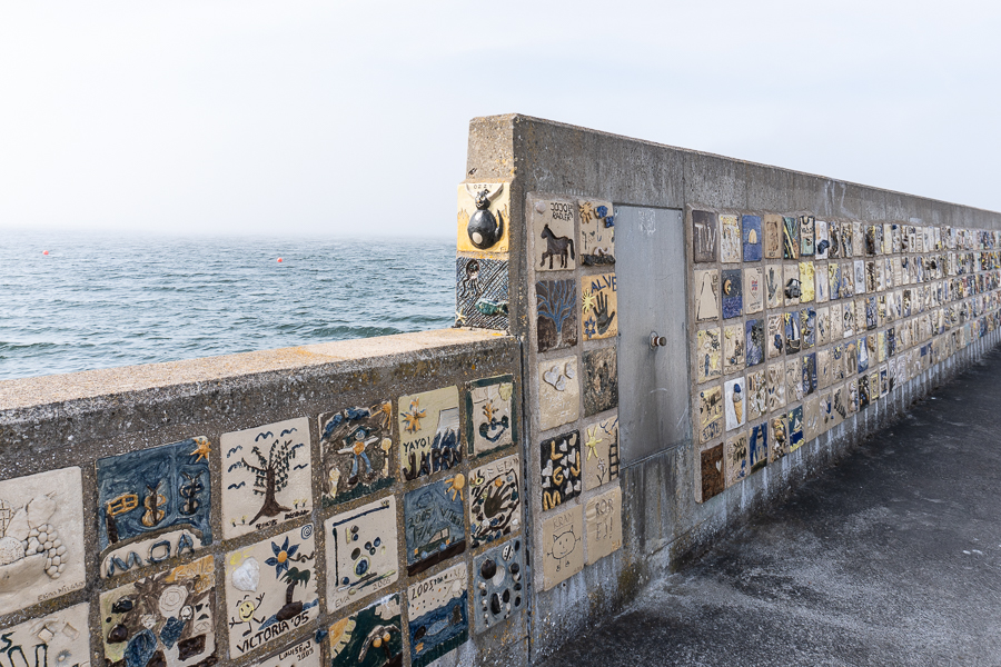 Von Kinderhand liebevoll gestaltete Keramikfliesen an der Südmole der Hafenkaimauer.