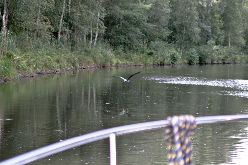 Schmetterlinge flattern mitten durch unser Boot, ein Graureiher begleitet uns mehrere Kilometer, als ob er uns den Weg zeigen möchte, vorbei an Biberburgen, und da ist er plötzlich:
