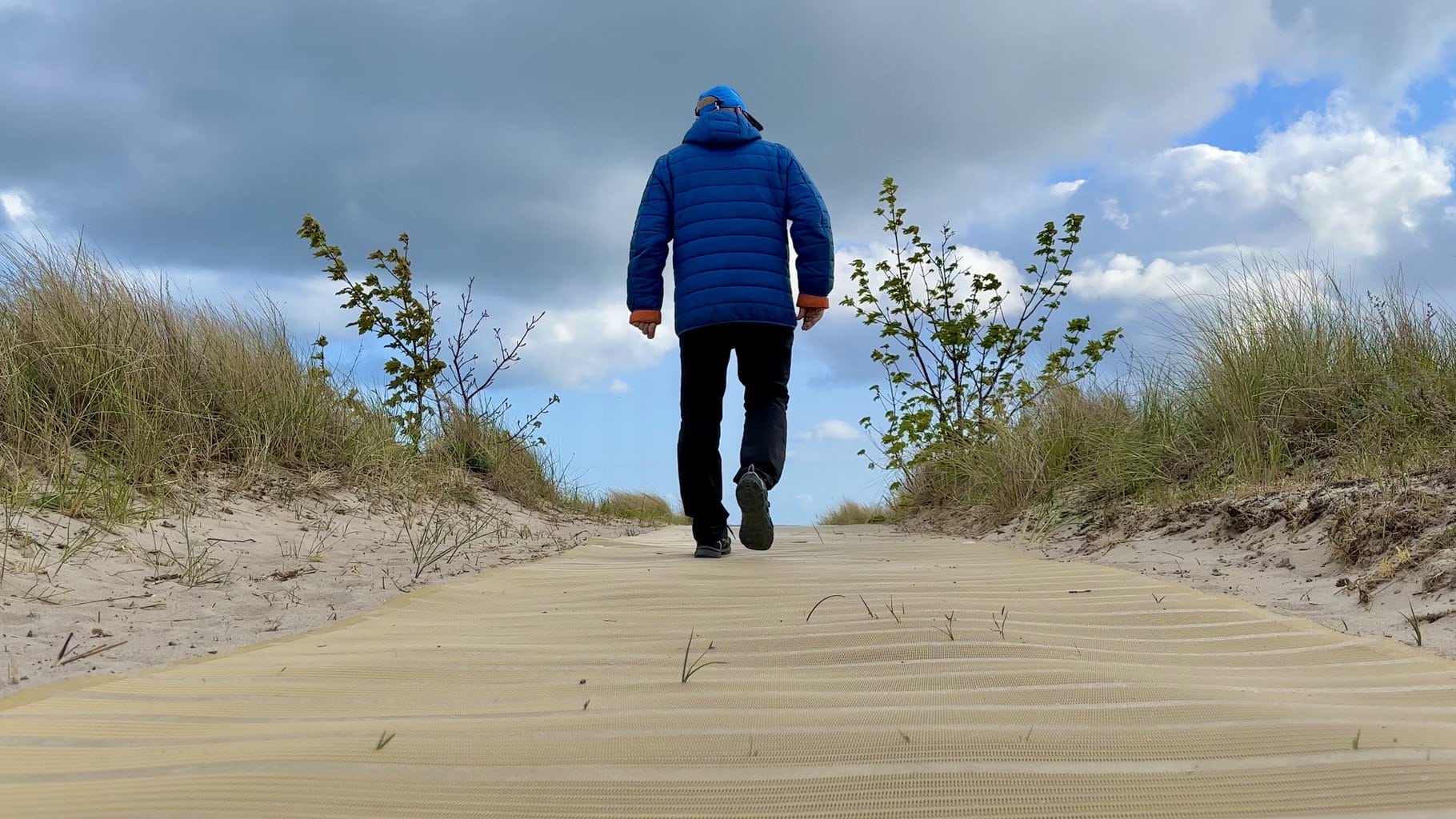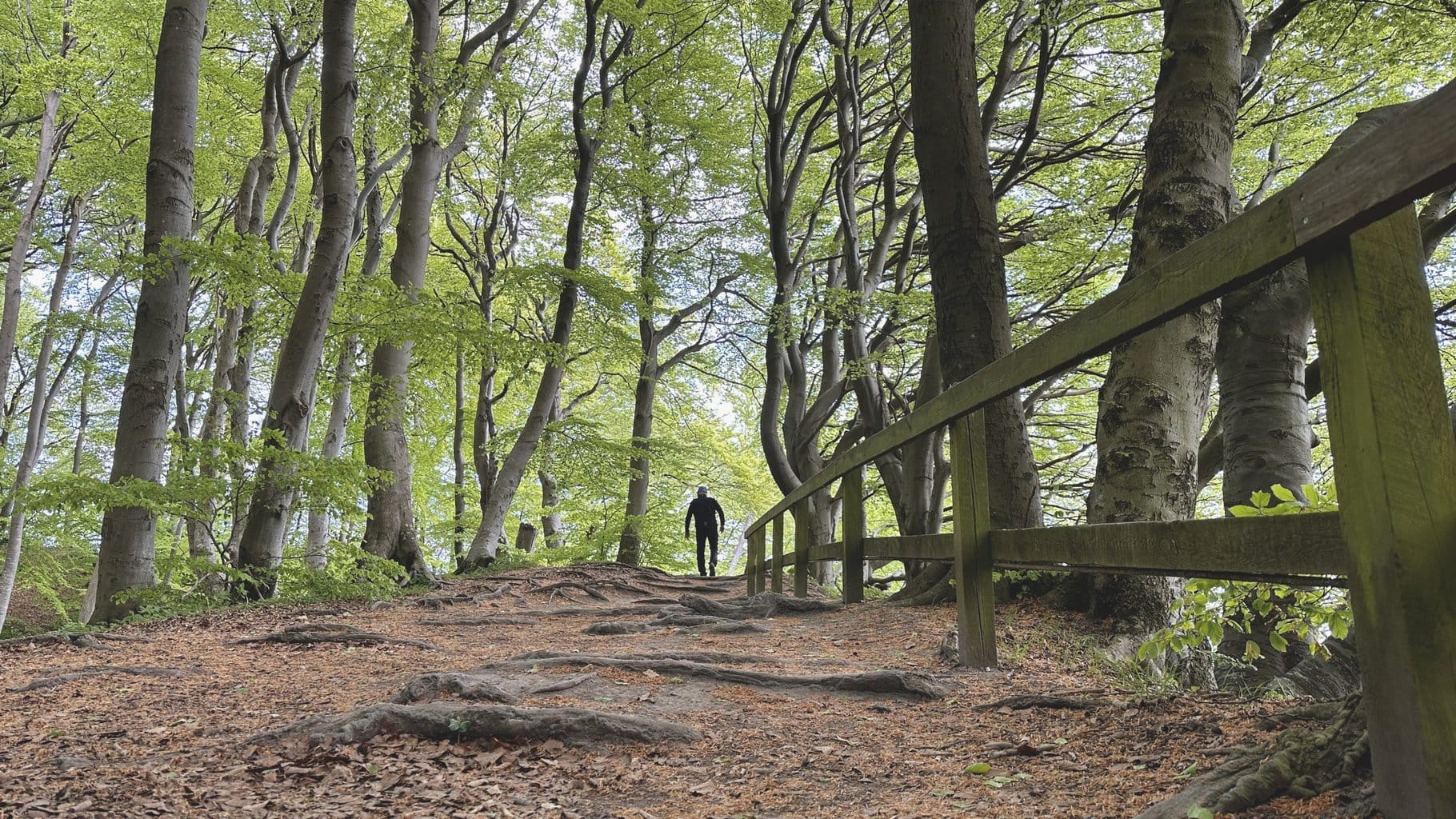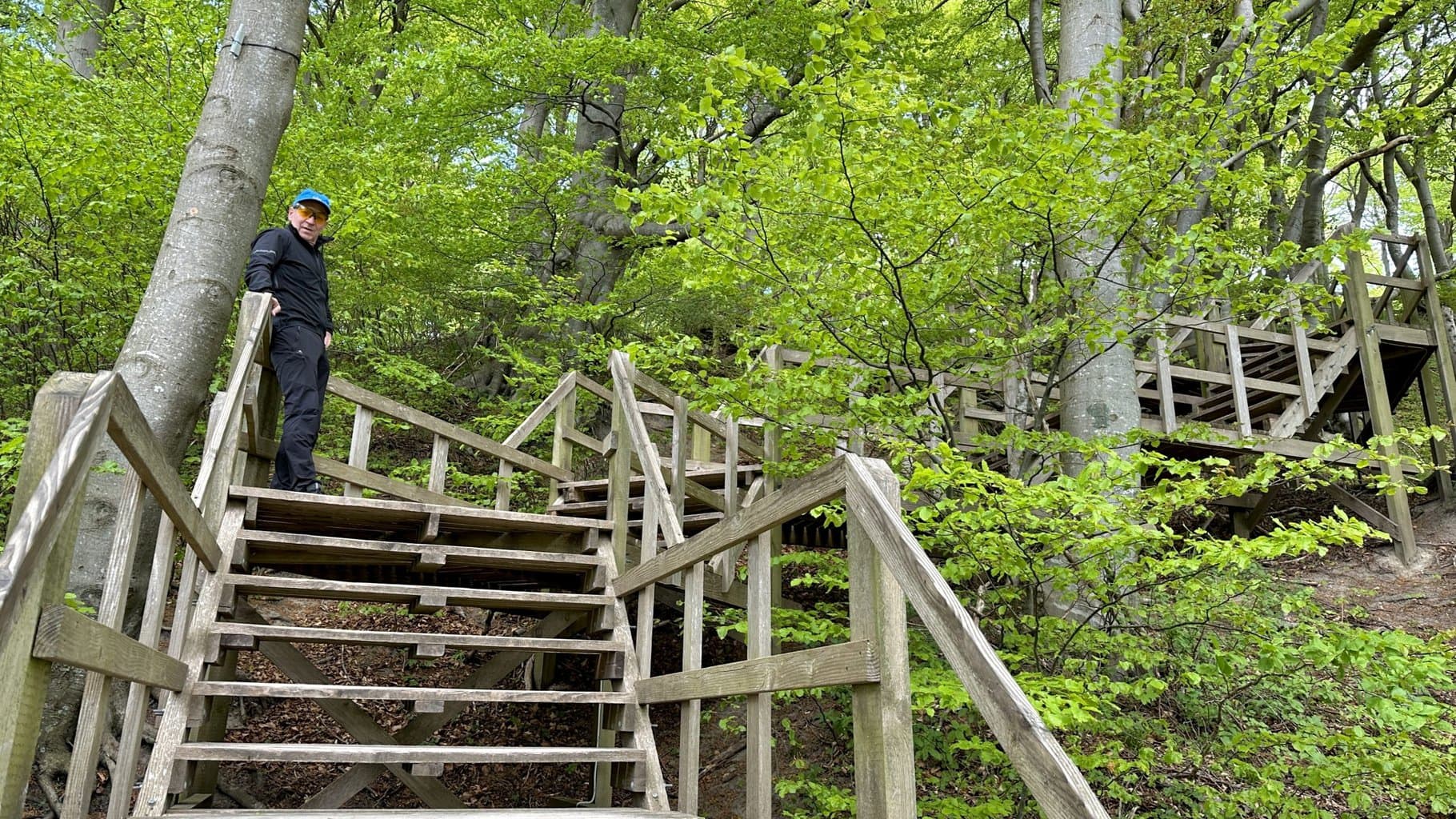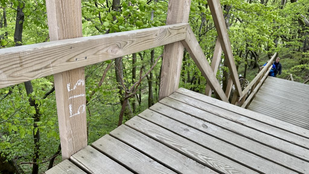 Wir tauschen Bike gegen Wanderschuhe: es beginnt die Wanderroute am GeoCenter Møns Klint. Unzählige Treppen gilt es zu erklimmen, um zur Klippe zu gelangen. Oben an der Abbruchkante der Steilküste dann die Belohnung: einen fantastischen Blick auf das Meer und das Waldgebiet bei Møns Klint.