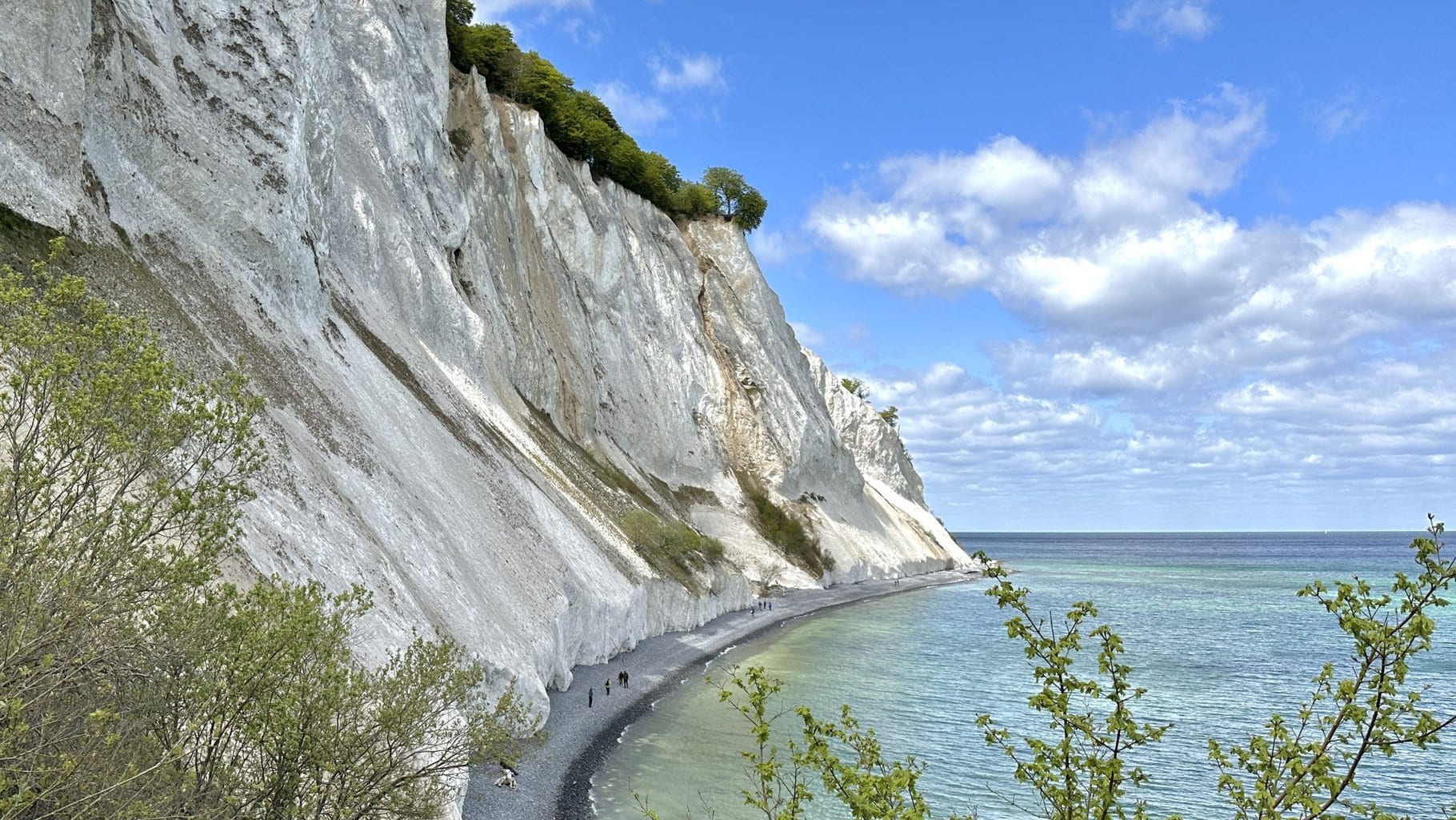 Die einzigartige Küstenlandschaft Møns Klint ist etwa 6 km lang und die weißen Kreidefelsen ragen mehr als 128 Meter von der türkisfarbnen Ostsee zum Buchenwald gekrönten Gipfel hinauf.