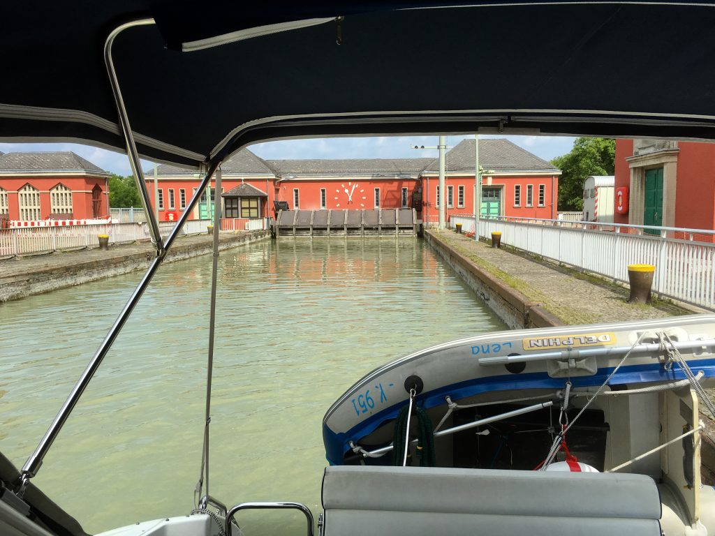 Bewappnet mit Schleusenhaken, Leine am Bug und an der Mittelklampe kann es losgehen. Zum Glück kommt Wolfgang mit aufs Gangbord, denn sogleich geht’s heftig zur Sache. Ein Umhängen des Schleusenhakens an der Leiter ist verdammt kräftezehrend, da in dem Moment, wo umgegriffen wird, das Boot sich sofort nach hinten und von der Schleusenwand entfernt.