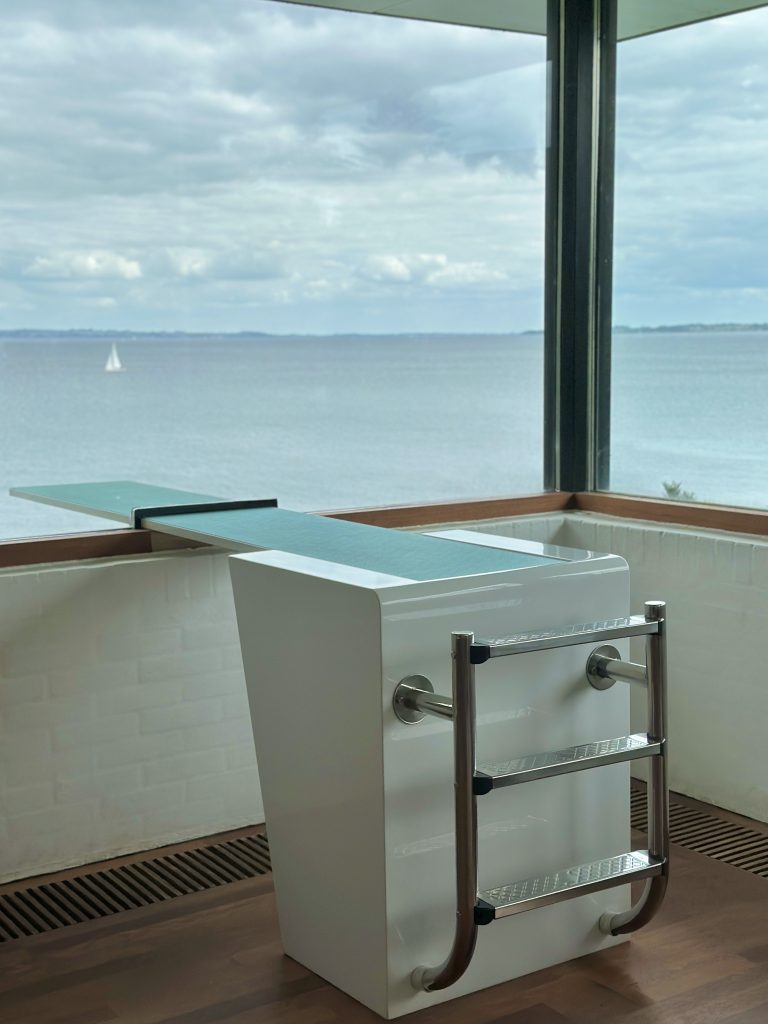 In einem der riesigen Räume auf der ersten Etage durchbricht eine Schwimmbad-Wippe das große Panorama-Fenster und ragt Richtung Meer hinaus.