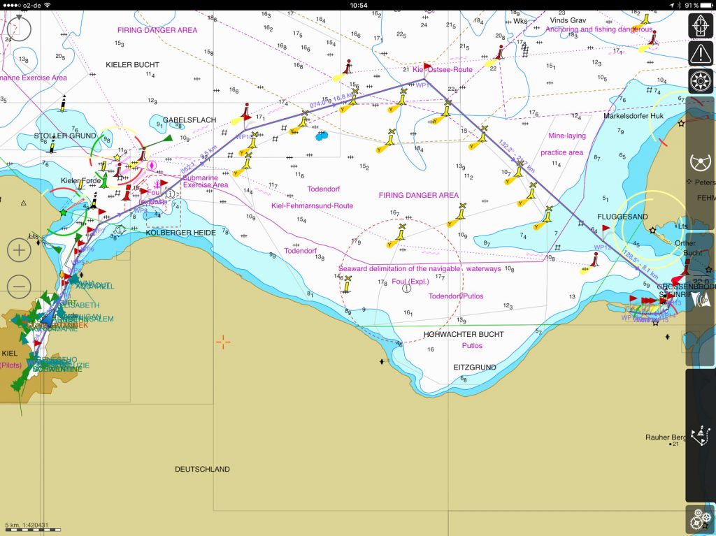 Nicht nur das Wetter erschwert unseren Törn, auch die Schießübungs-Zielgebiete ‚TODENDORF‘ und ‚PUTLOS‘ in der Hohwachter Bucht zwingen uns zu einem weiten Schlag um die äußeren Gefahrenbereiche. Wir müssen über die offene See!