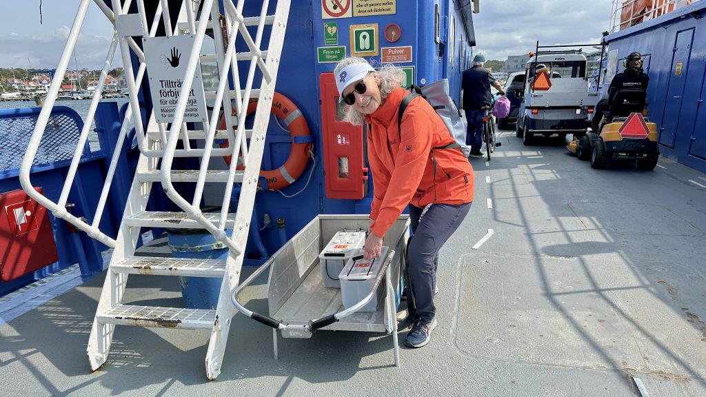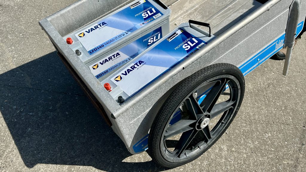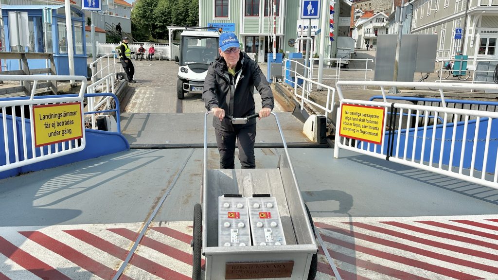 Es geht Schlag auf Schlag. Ab 14:00 Uhr sind die Batterien abholbereit. Also heißt’s für uns mit der Fähre rüber nach Koön zur Werkstatt, Handwagen geschnappt, zwei riesige 35-kg-Stromblöcke eingeladen, wieder zurück zur Allure – so viel zu unserem heutigen Workout 😉.