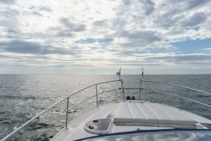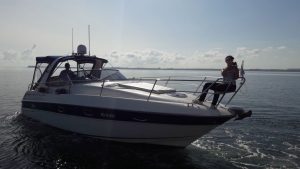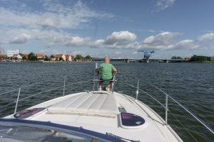 Wir werden immer mutiger: Windstärke 4, es zeigen sich weiße Schaumkrönchen und wir laufen trotzdem aus!In Verdrängerfahrt geht’s im engen Fahrwasser durch die Boddengewässer nach