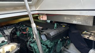 Der Captain und seine ungeahnten Fähigkeiten: Wie ein Schlangenmensch kriecht, dreht und schlängelt sich mein Captain hinter die Backbordmaschine. Das jedoch nicht ohne Not. Jeder