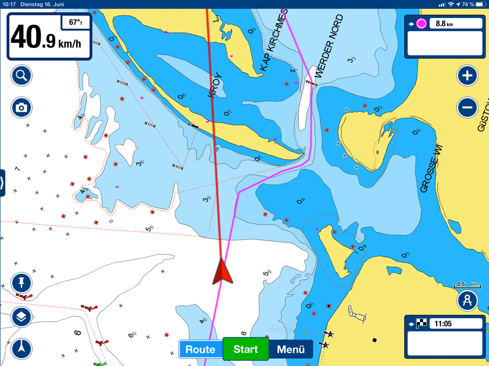 dank zugelassener Maximalgeschwindigkeit von 8 Knoten, führt dazu,
