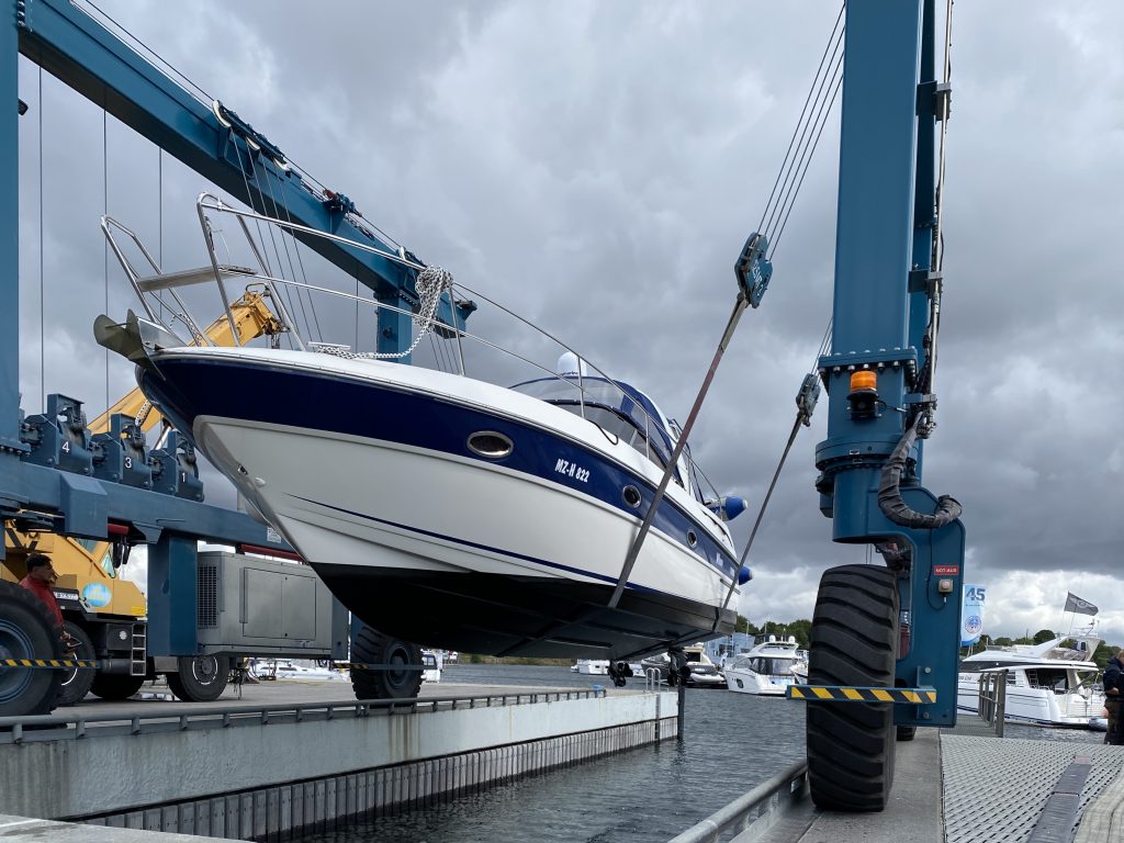 Es ist also an der Zeit für uns, aus dem Wasser zu gehen. Der Wind, der uns immer wieder in die Schranken verwies, ist auch beim Auskranen mit dabei (5bft) – wahrscheinlich zum Abschied.