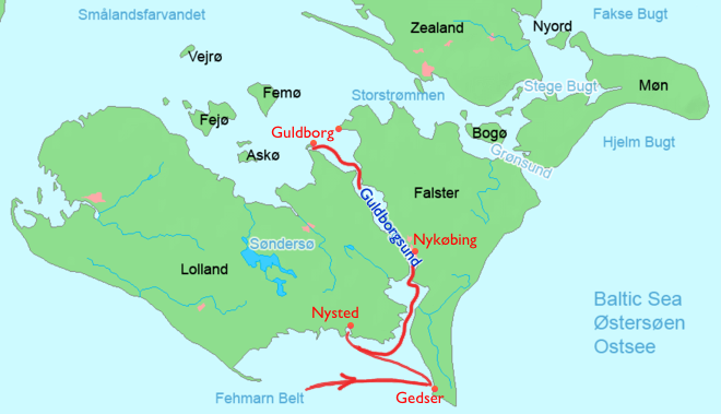 Heute folgen wir dem Guldborgsund bis zur nördlichen Einfahrt ins Smålands-Fahrwasser .