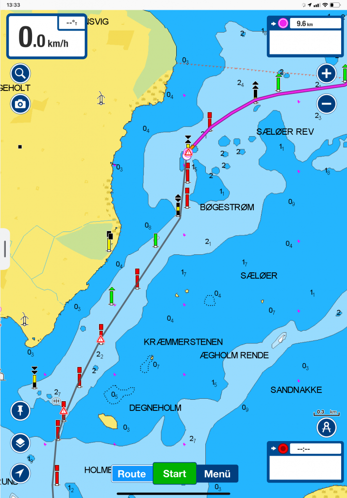 Links die komplette Route (22,7 sm) – rechts das Fahrwasser im Bøgestrom
