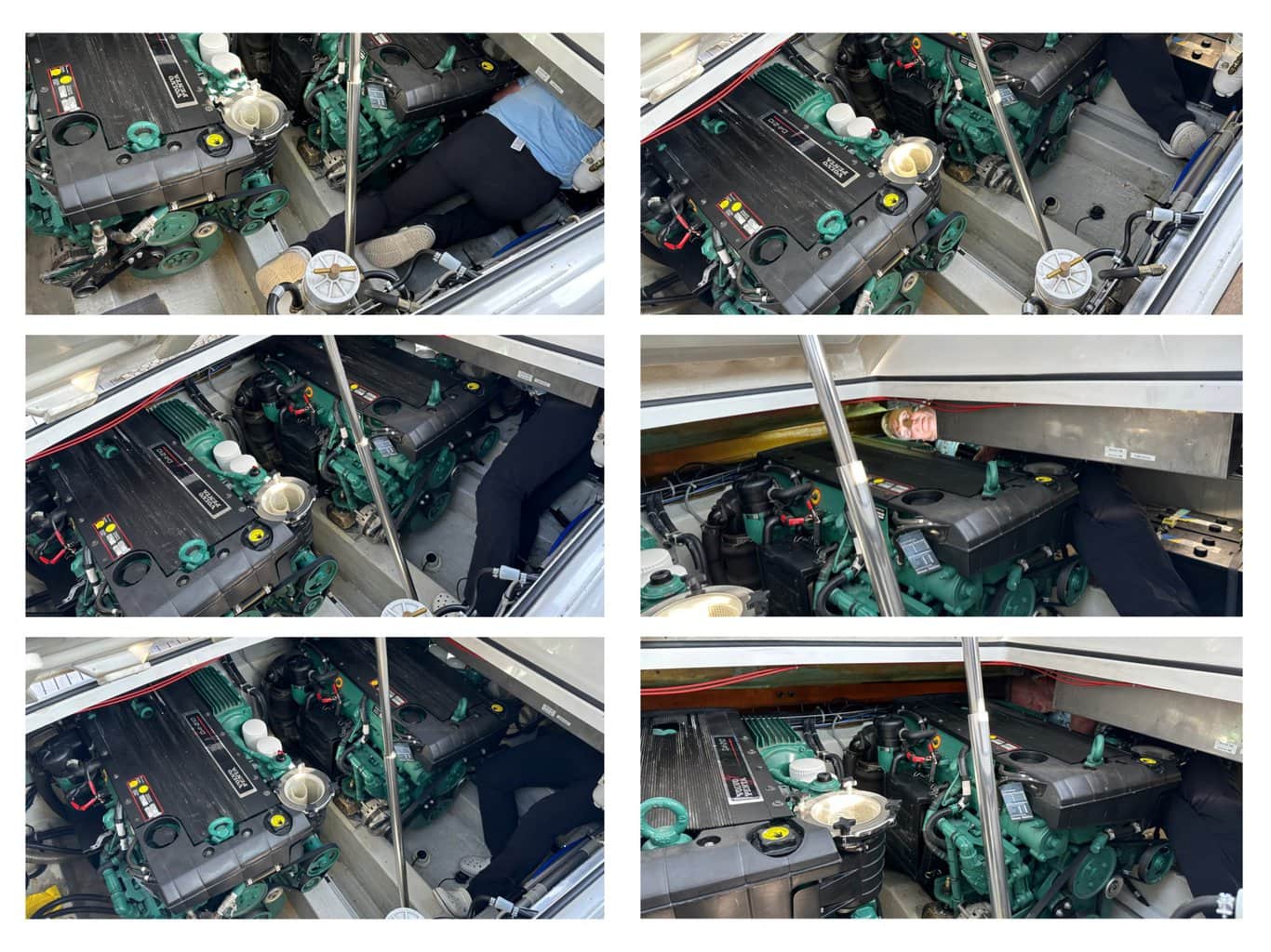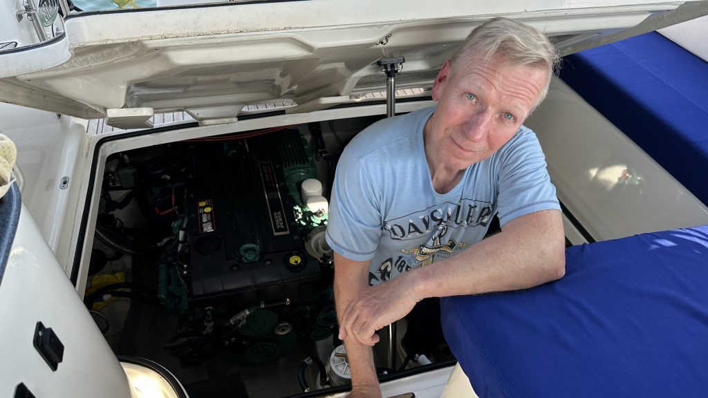 Wie ein Schlangenmensch kriecht, dreht und schlängelt sich mein Captain hinter die Backbordmaschine.