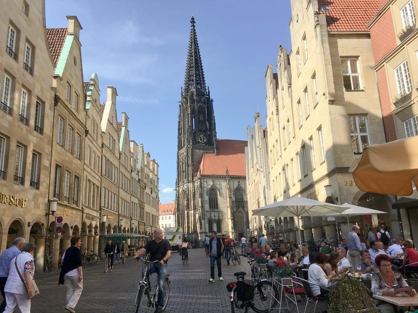 Sehenswert: der historische Stadtplatz von Münster – Prinzipalmarkt – mit Rathaus und Kirche St. Lamberti