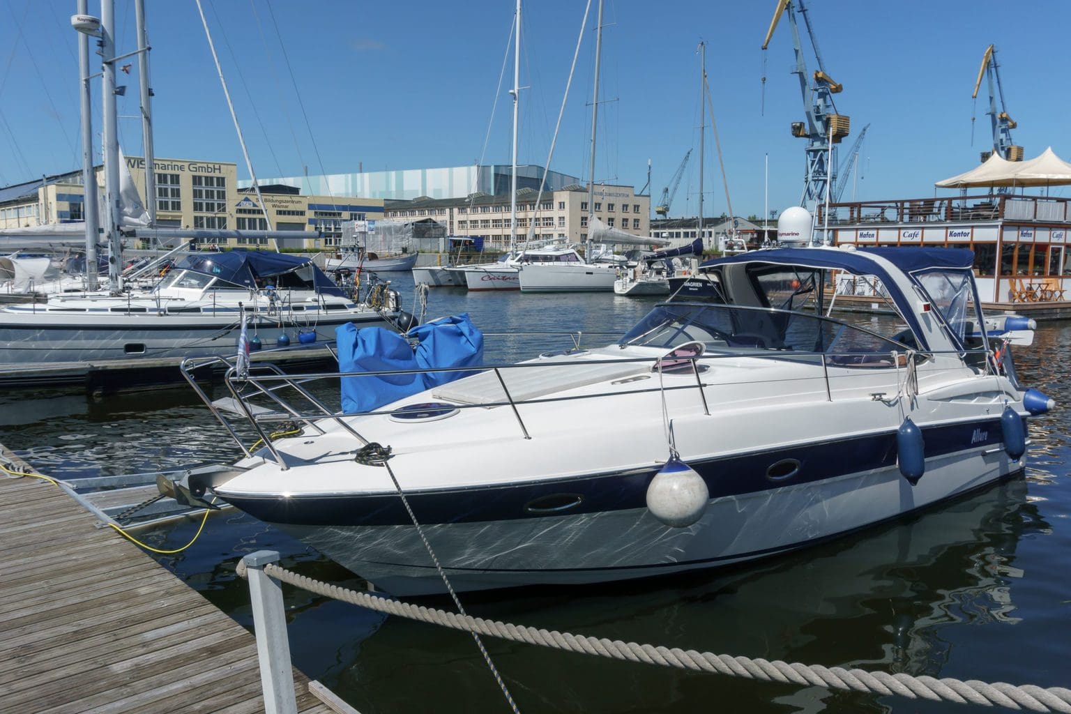 Heute haben wir die Qual der Wahl: in der alten Hansestadt Wismar können wir gleich unter fünf Häfen auswählen. Wir entscheiden uns auf Empfehlung für den ‚Westhafen‘. So sind wir schnell im Zentrum des Geschehens und in der Nähe des Alten Hafens.