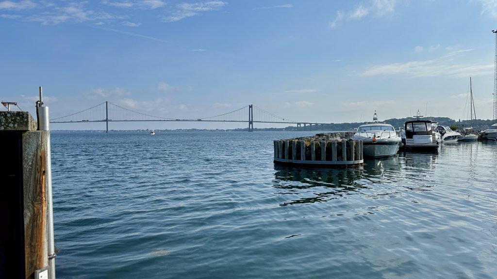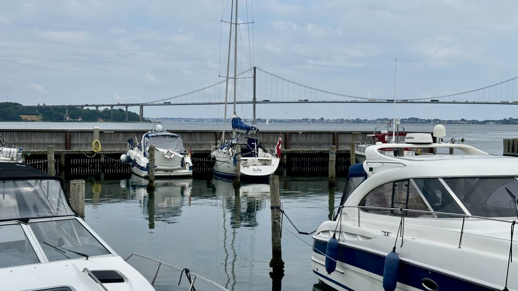 Für uns gibt’s einen super ‚Erste Reihe-Blick‘ auf den Kleinen Belt (Lillebælt) mit der alten Eisenbahnbrücke (Den Gamle Lillebæltsbro) und der großen neuen Brücke (Den Nye Lillebæltsbro).