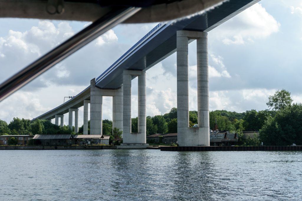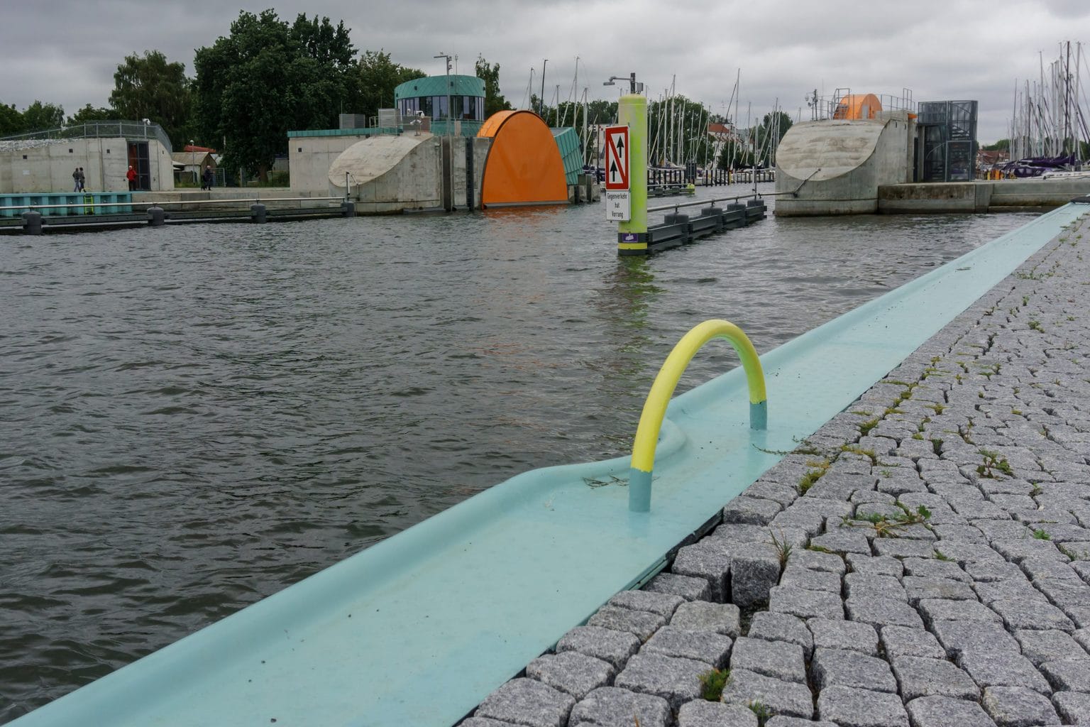 Kurz hinter den Molenköpfen: das Sperrwerk Greifswald-Wieck, denn hier drohen immer wieder Sturmfluten. In der Durchfahrt dreht sich dann eine Sperre nach oben und zusätzlich fahren Schiebetore aus den Deichen rechts und links der Sperre.