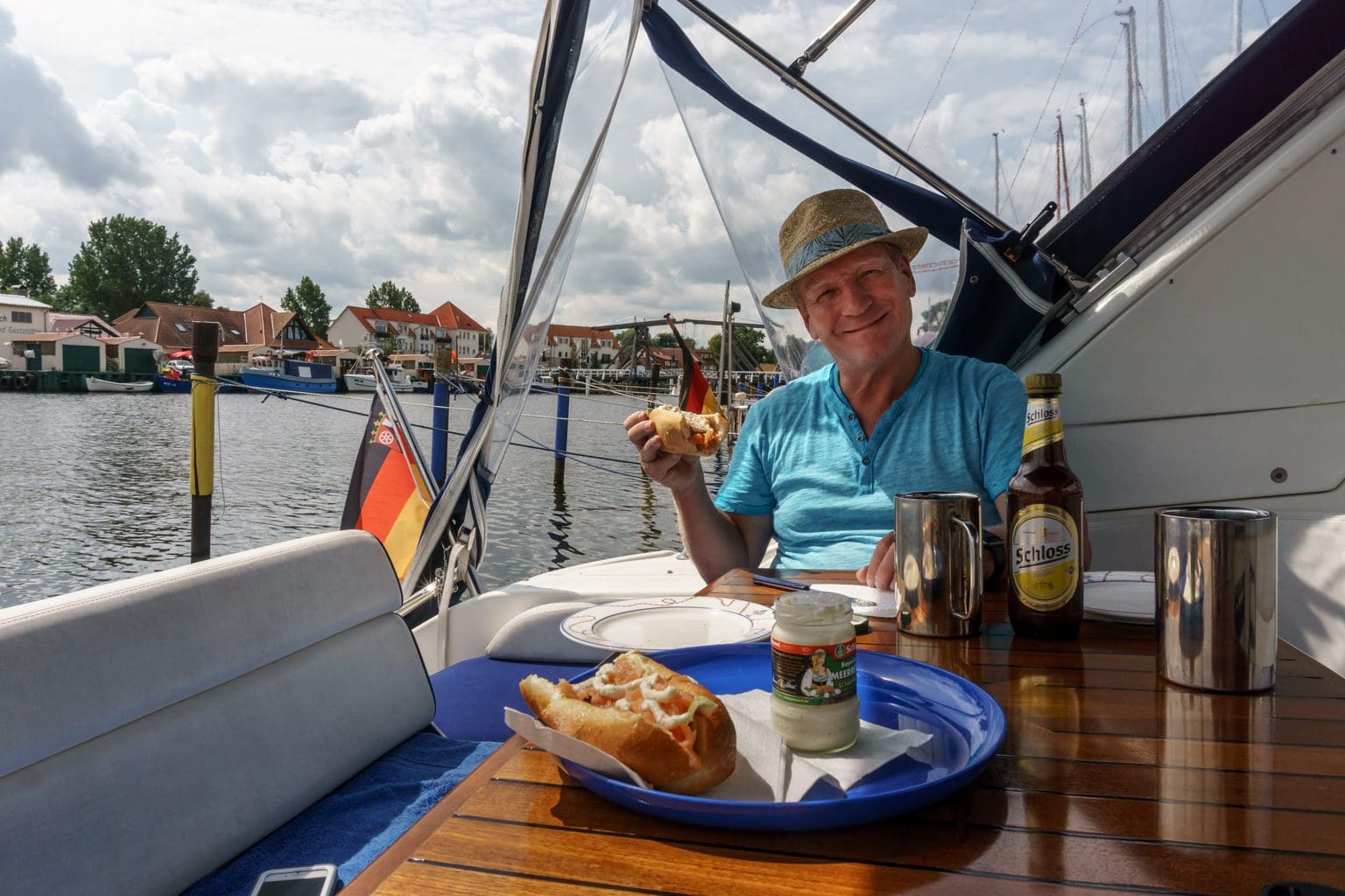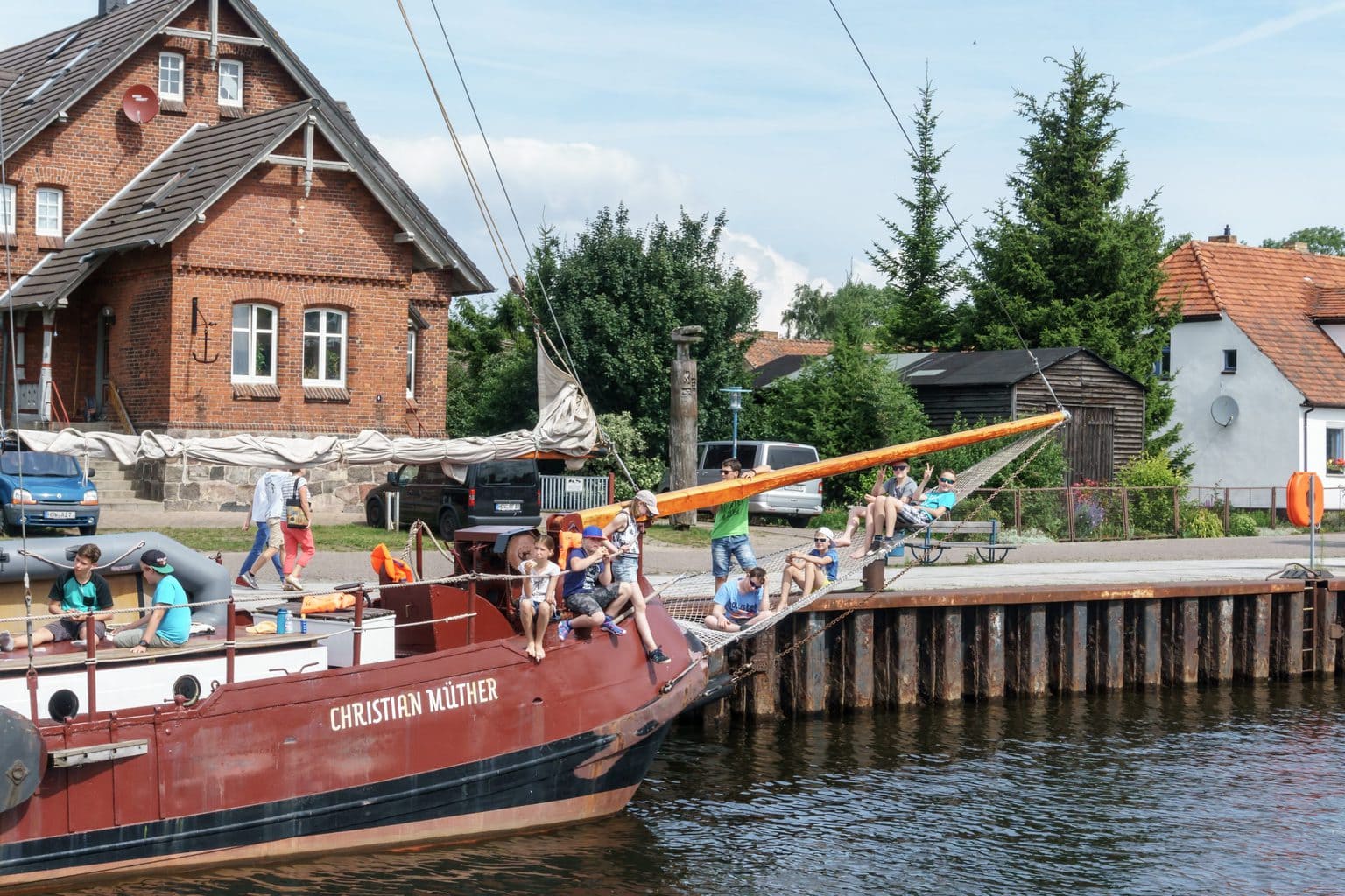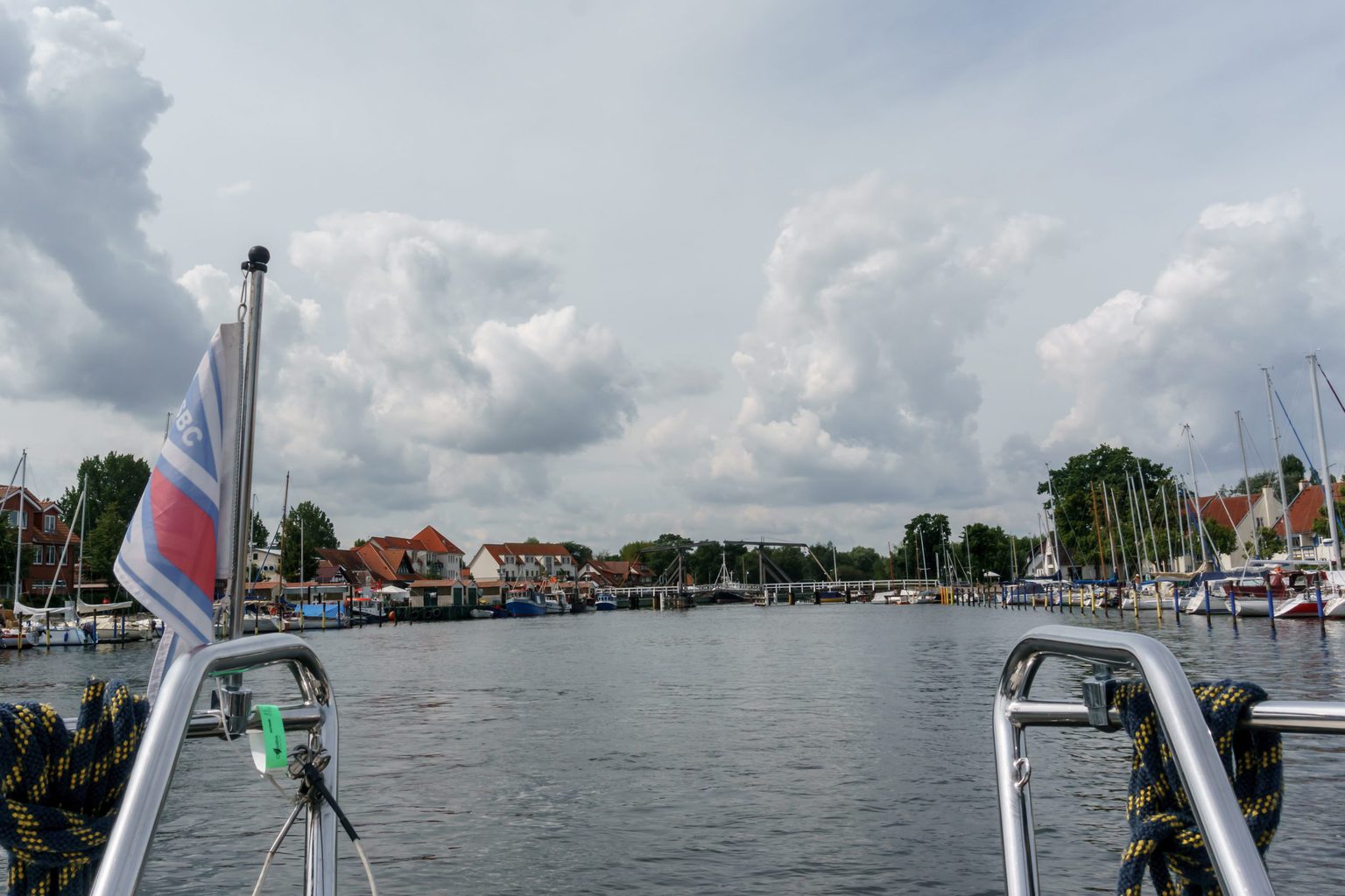 Wir finden einen freien Liegeplatz unmittelbar vor der hölzernen Zugbrücke in Wieck. Hier mündet das kleine Flüsschen Ryck aus Greifswald kommend in die Dänische Wiek.