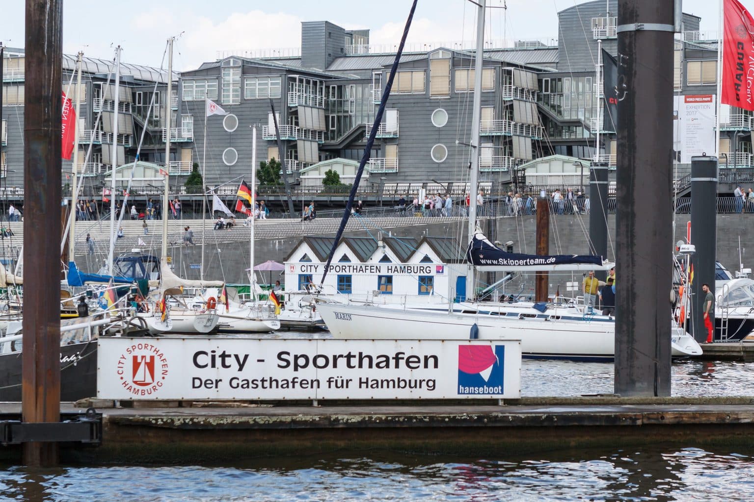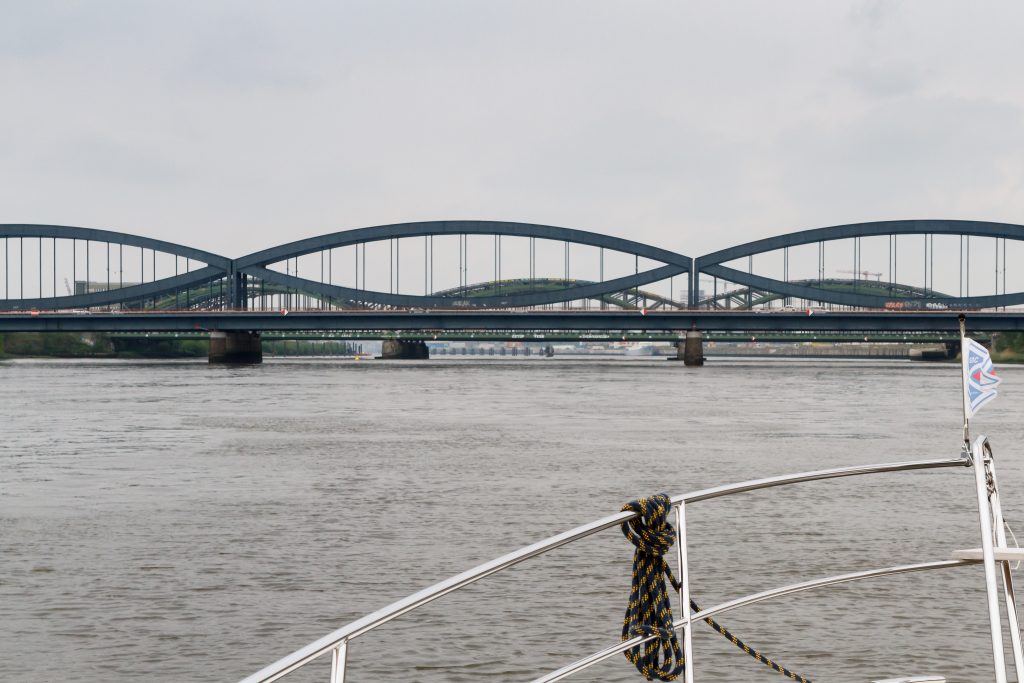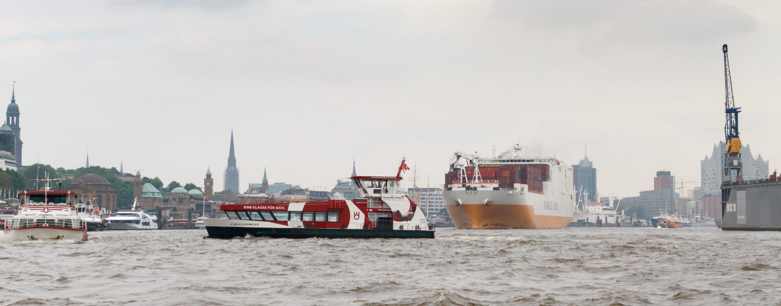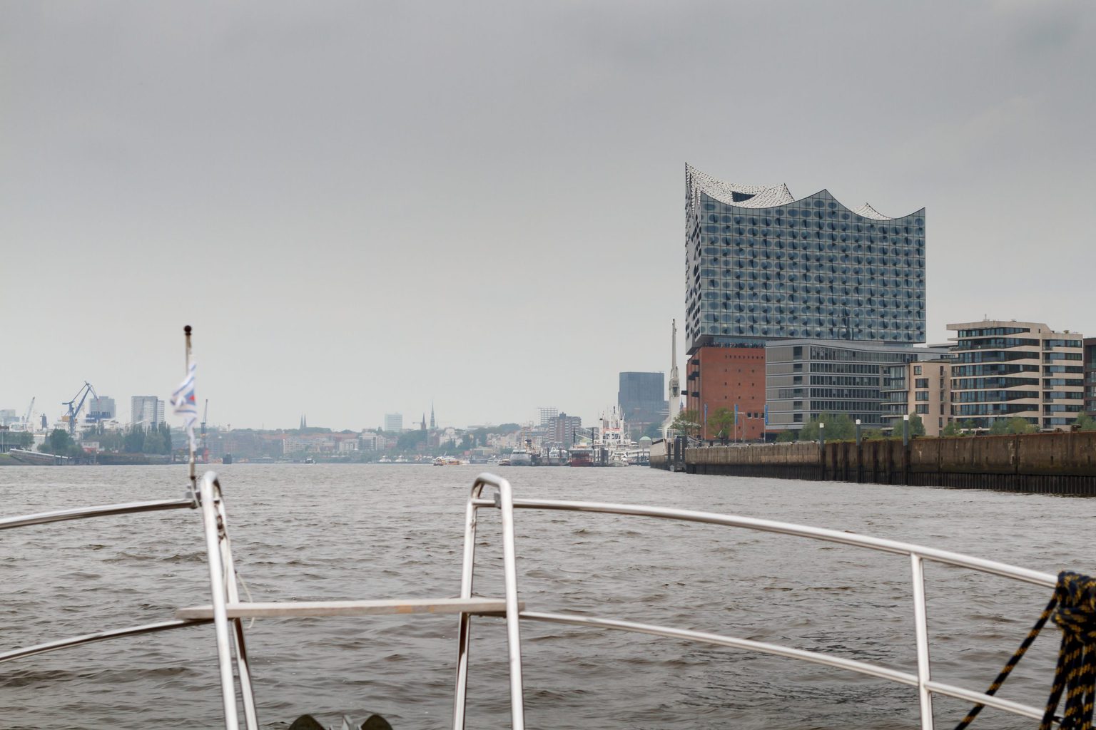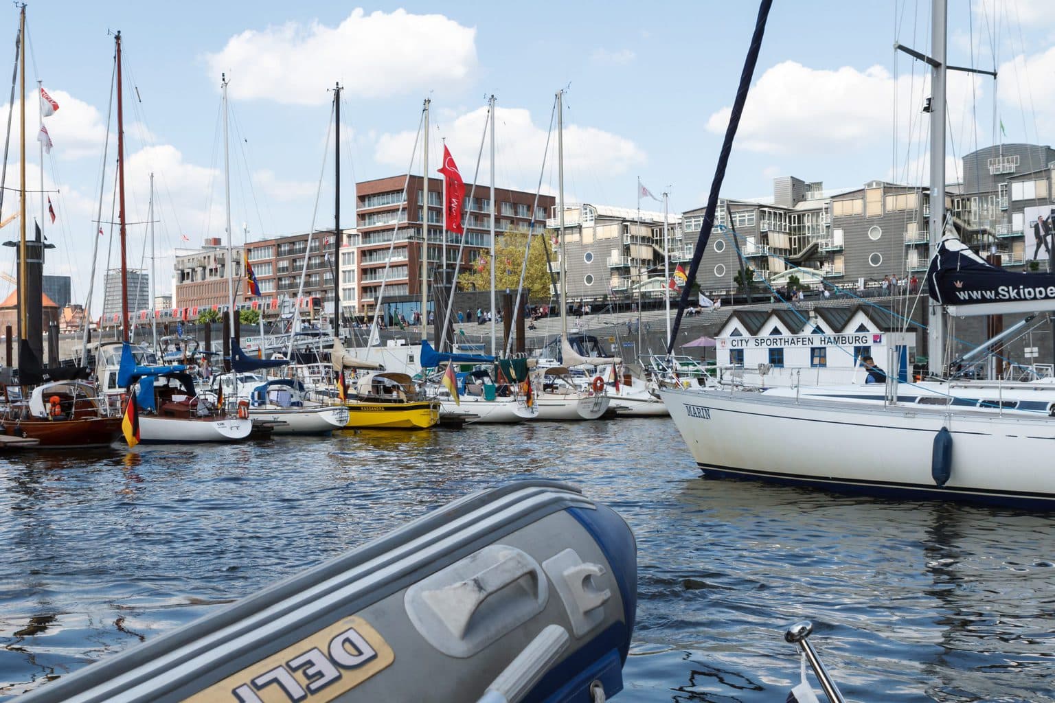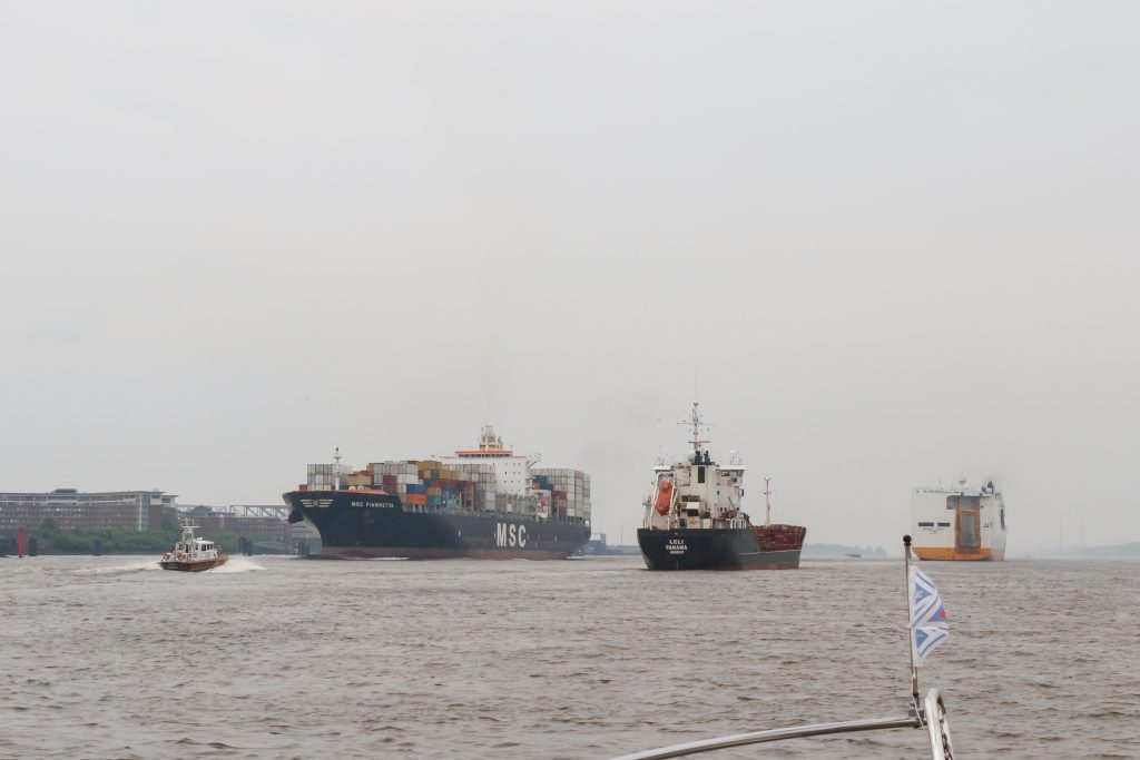 Durch die Kaimauern werden die Wellen der Barkassen, Ausflugsdampfer, Fähren, Schlepper und Großschifffahrt (von allen gibt’s reichlich !) in sämtliche Richtungen reflektiert und es entstehen unangenehme Wellen – was uns als gebriefte Rheinskipper jedoch nicht schockt.