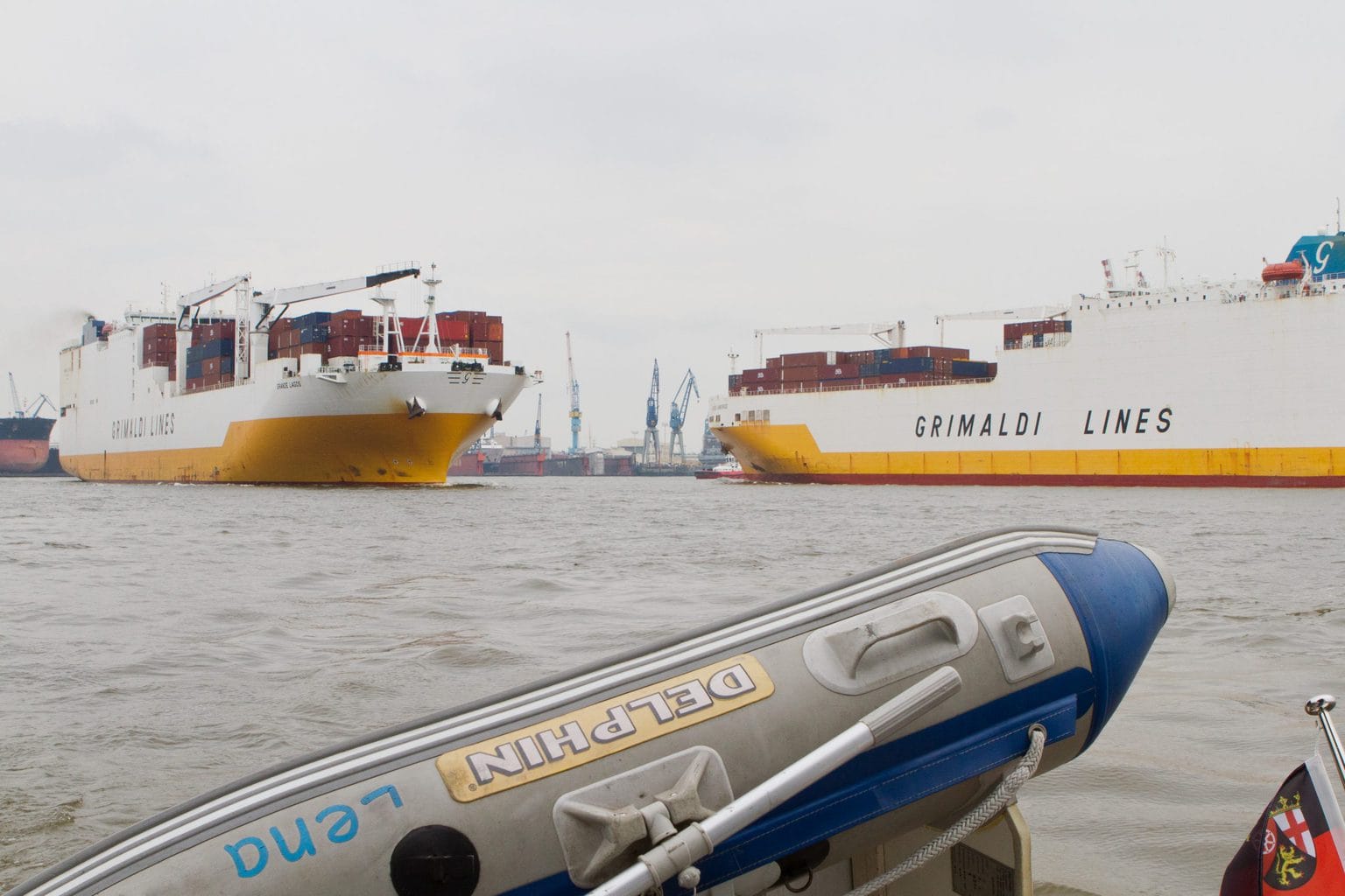 Oder: „Das große gelbe Teil, welchen Kurs geht ihr“ – gemeint war Grimaldi Lines.