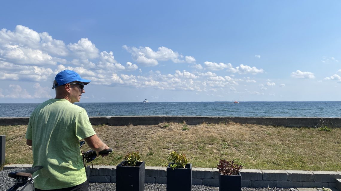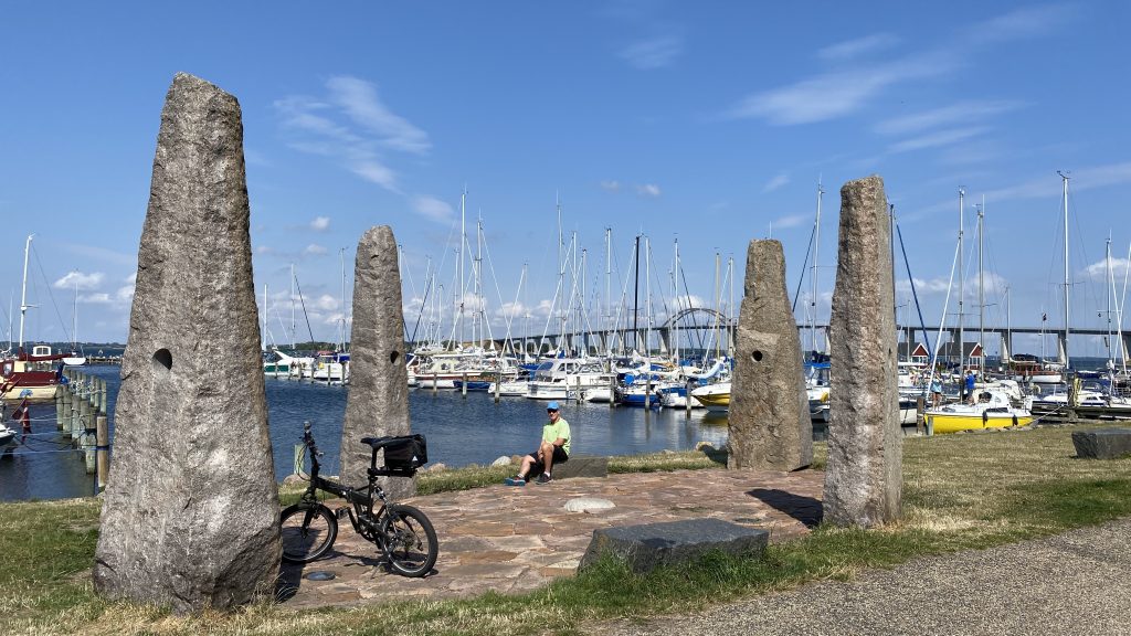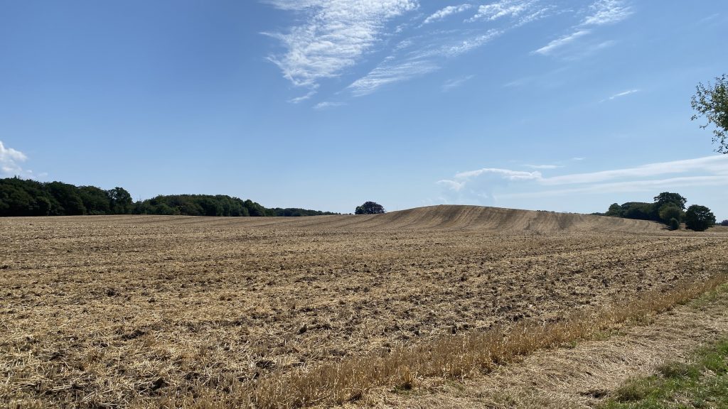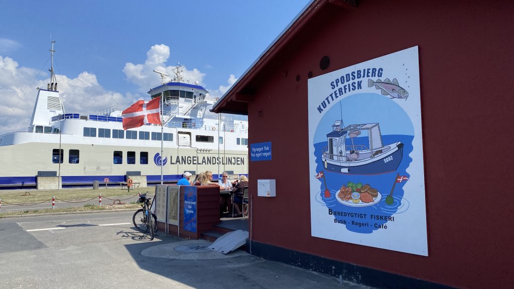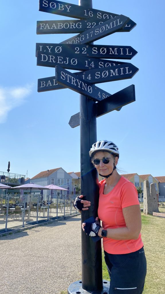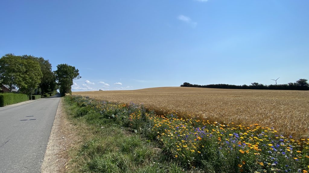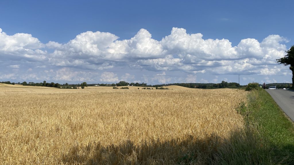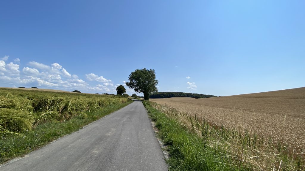 Es gibt einen wunderschönen Fahrradweg von Rudkøbing nach Spodsbjerg am Großen Belt. Auf gut ausgebauten Wirtschaftswegen zwischen Kornfeldern und Wiesen genießen wir die hyggelige abwechslungsreiche Landschaft mit ihren Huthügeln  (‘Hatbakker’), die an riesige Strohhüte erinnern. Und weil die Hintour incl. Adrenalin-Stoß so viel Spaß gemacht hat, nehmen wir dieselbe Route jetzt mit Rückenwind wieder zurück.
