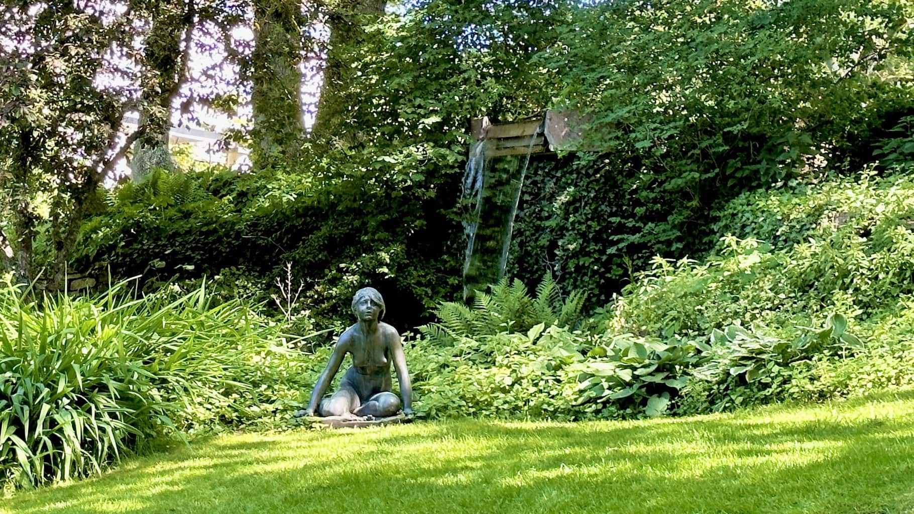 Wasserspiel „Kaskad“ mit Mädchengestalt im Gras und kleinem Frosch aus Bronze